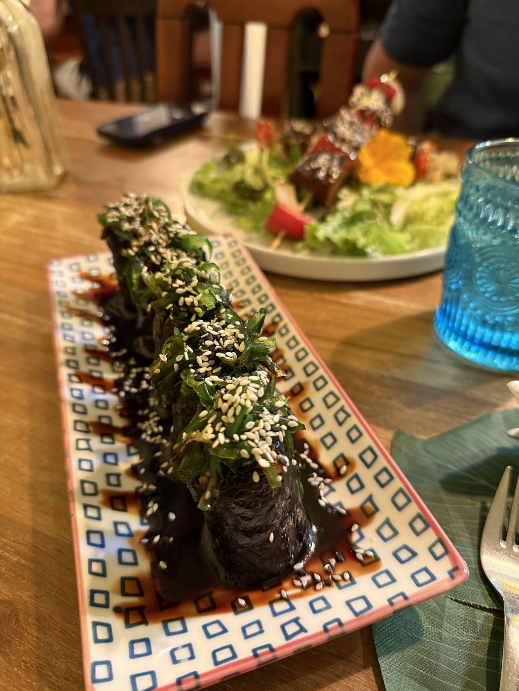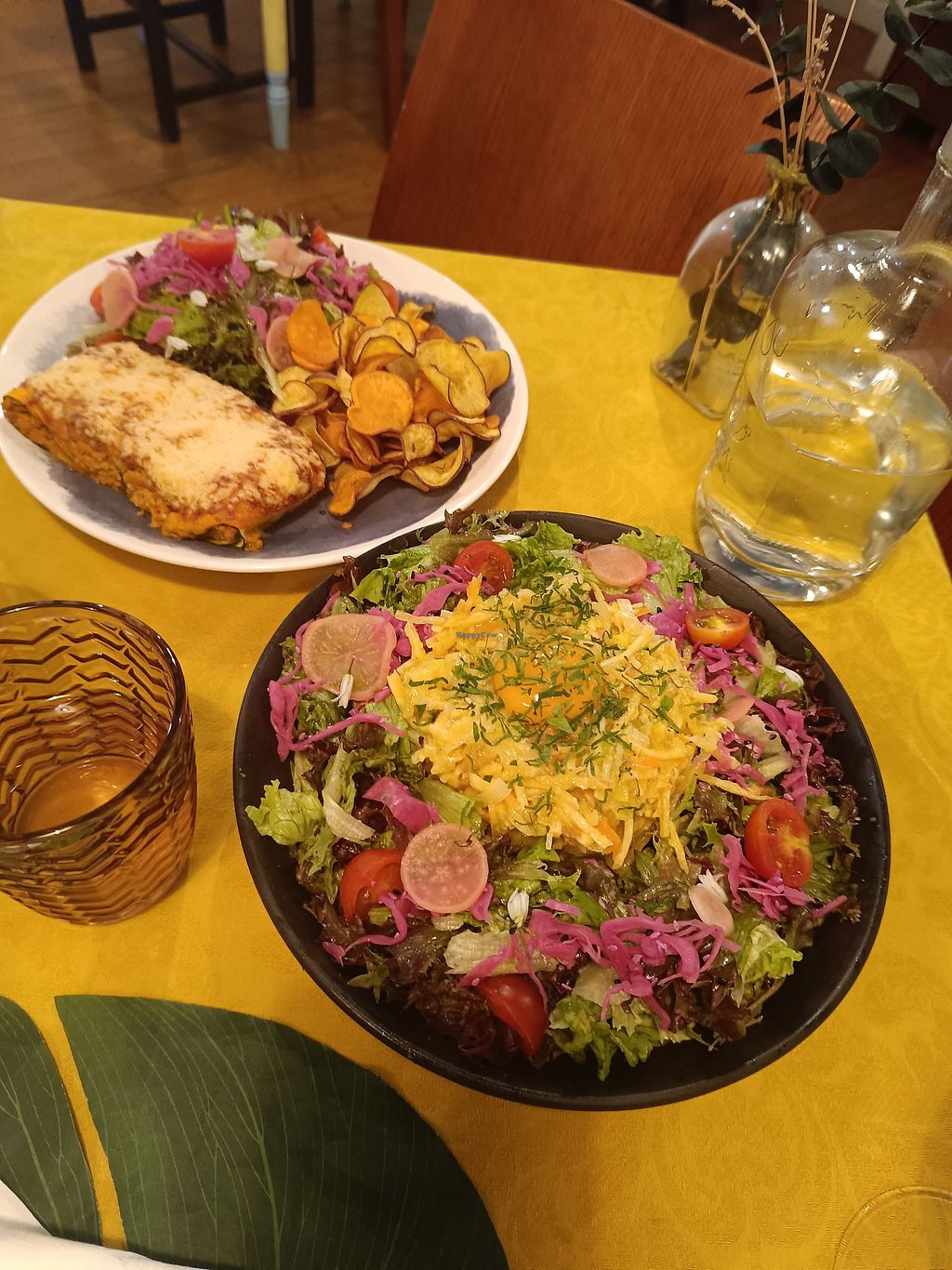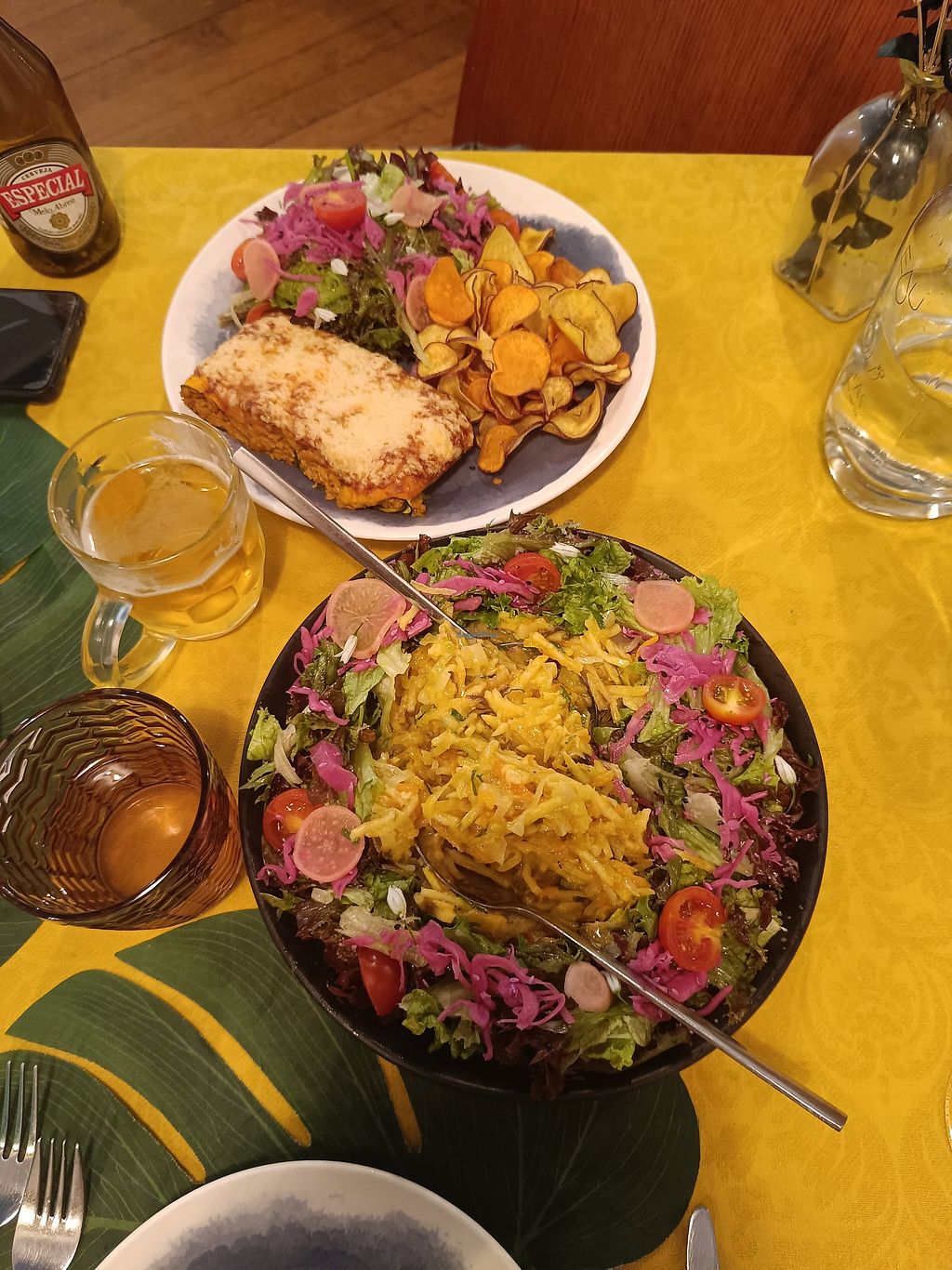 Courgette Cannelloni with vegan cheese, sweet potato crisps and salad …