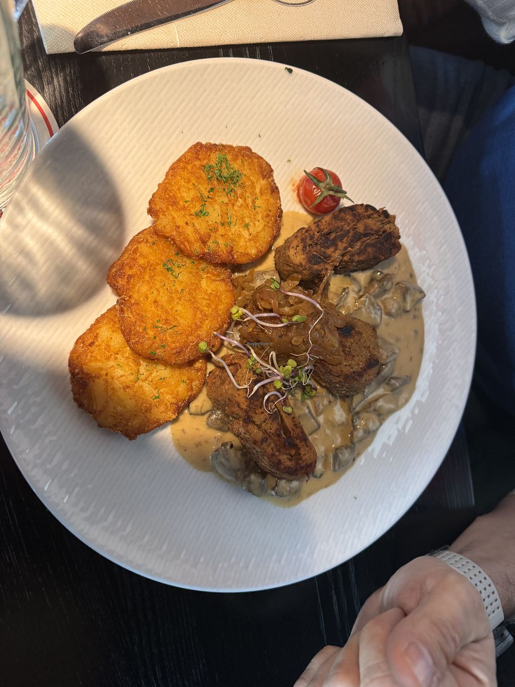 Der vegane Zwiebelrostbraten war trocken und hat nach nichts geschmeckt - die Pilzsauce und die Rösti dazu waren gut!