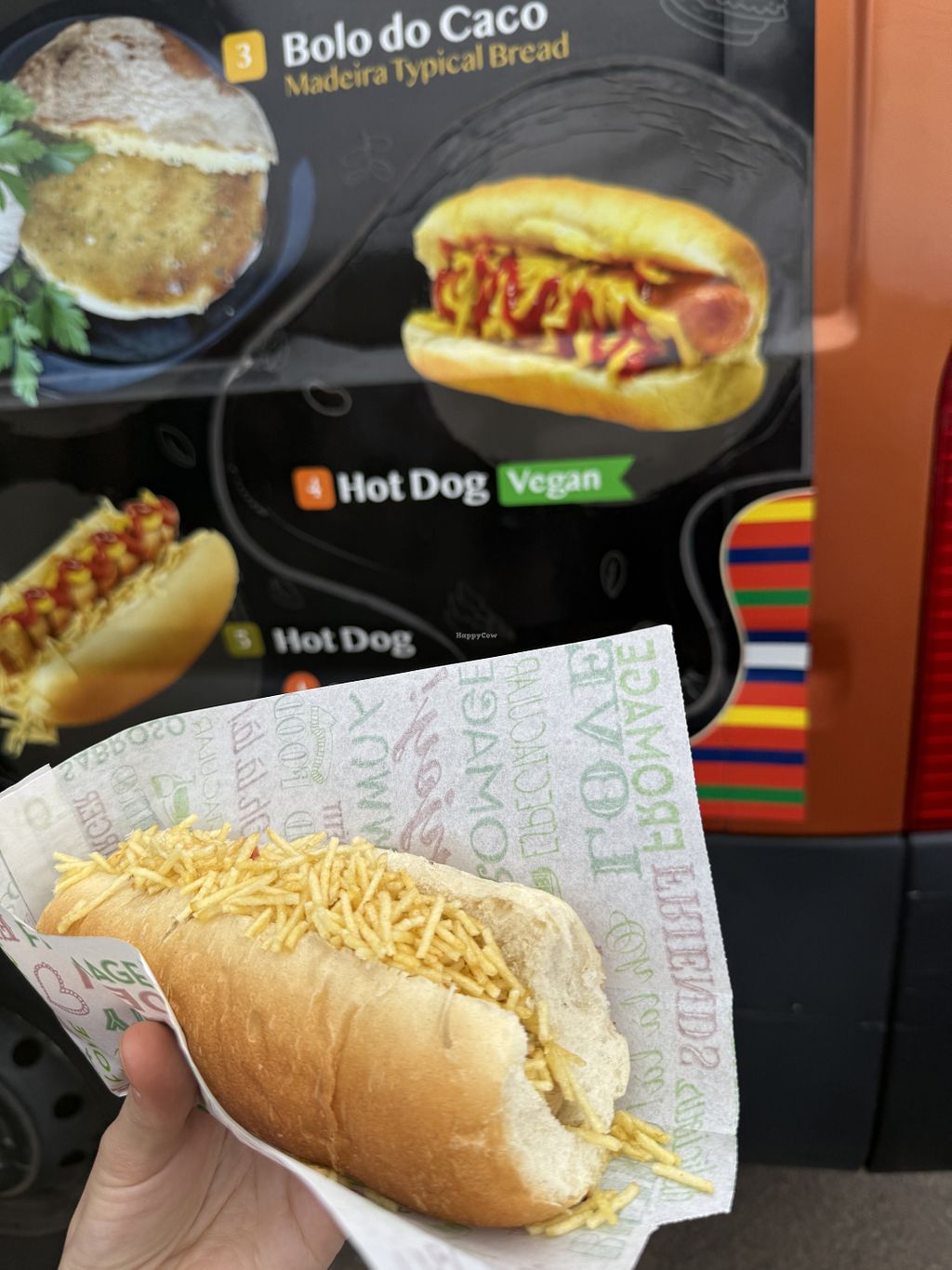 Vegan options are clearly labeled on the menu. They sell vegan hotdogs (€6.50) and vegan garlic bread (€6). The truck is run by a lovely couple - the lady speaks very good English.