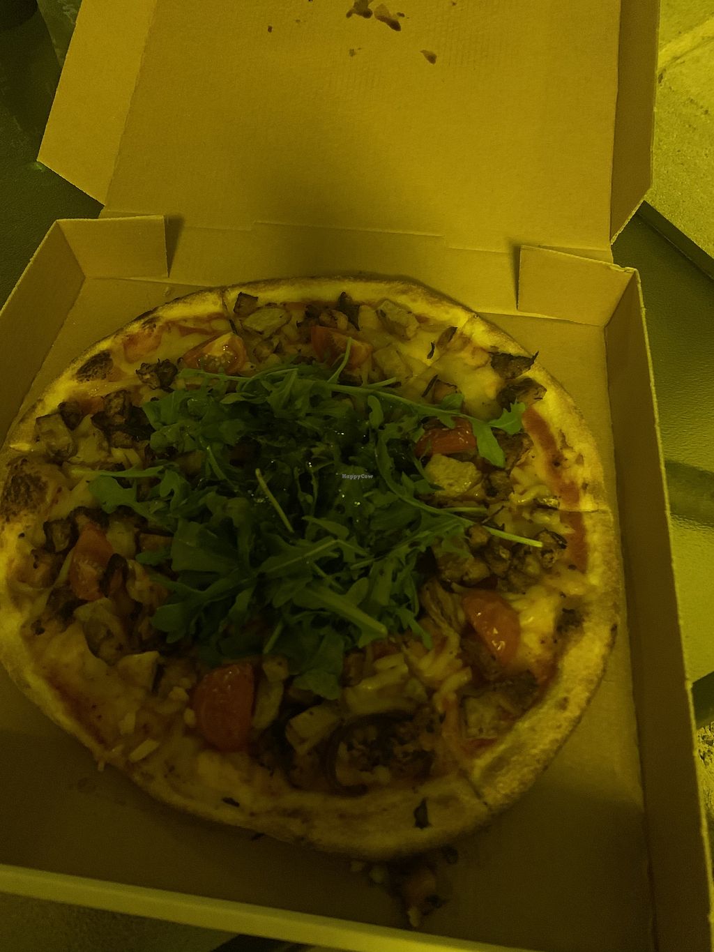Super tasty, good size pizza, fresh rocket on top and cute vegan stamp on the box. I had without olives. Cheese was good, not chalky like some can be.