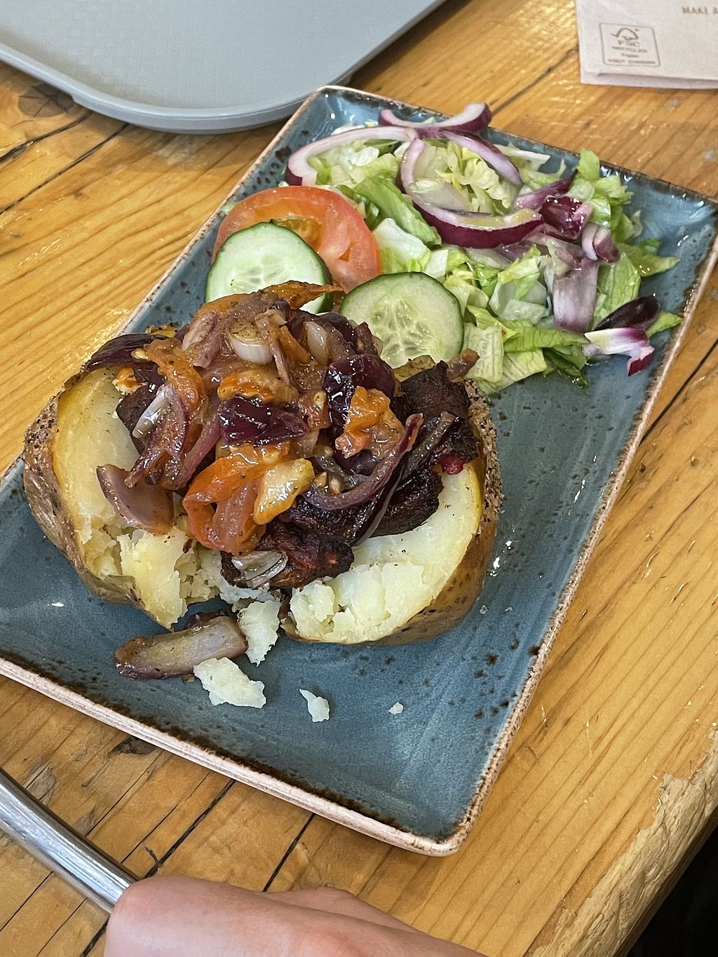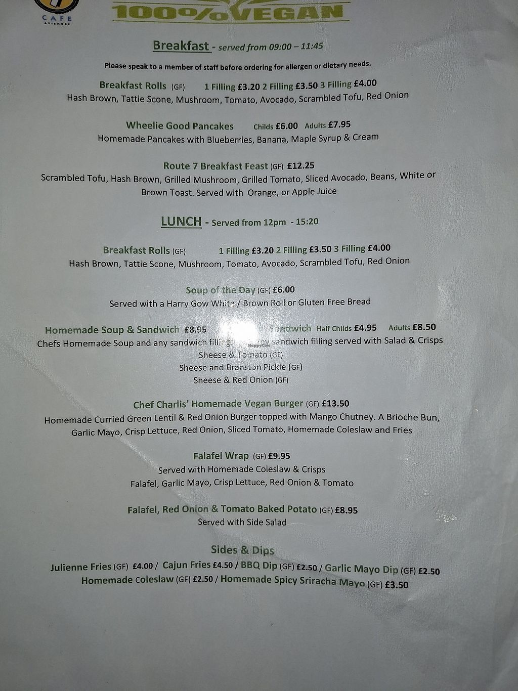 Enjoyed the 100% vegan menu. Had a filled roll with mushroom, avocado, tofu scramble and coleslaw and cajun fries. Also, it is a lovely vegan hot chocolate with cream. Great staff who helped me decide what to order.