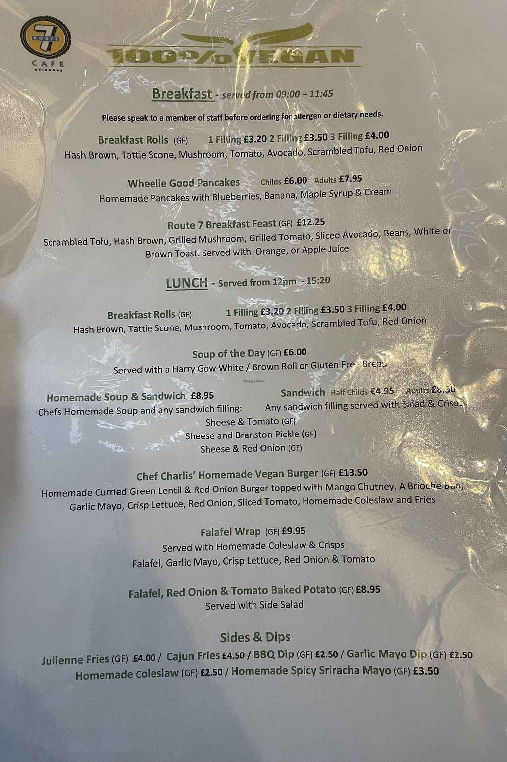 No spending your lunch looking for little green dots or vg's, Route 7 has all their vegan food on a full menu. And there are plenty of options. Surprisingly cozy upper floor cafe. Tasty food and helpful staff.