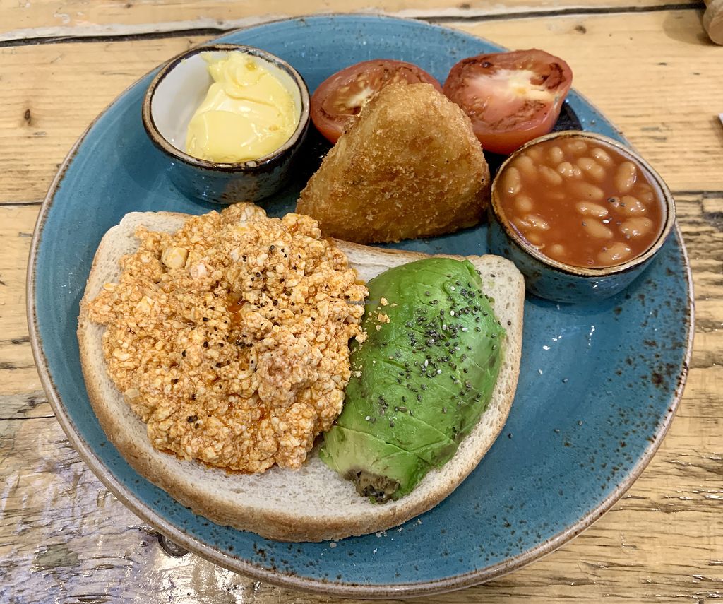 Great "vegan feast breakfast". Hash brown, scrambled tofu, tattie scone, avocado, baked beans, tomato, toast, hummus, spinach and orange juice, tea or coffee. Very tasty and great service.