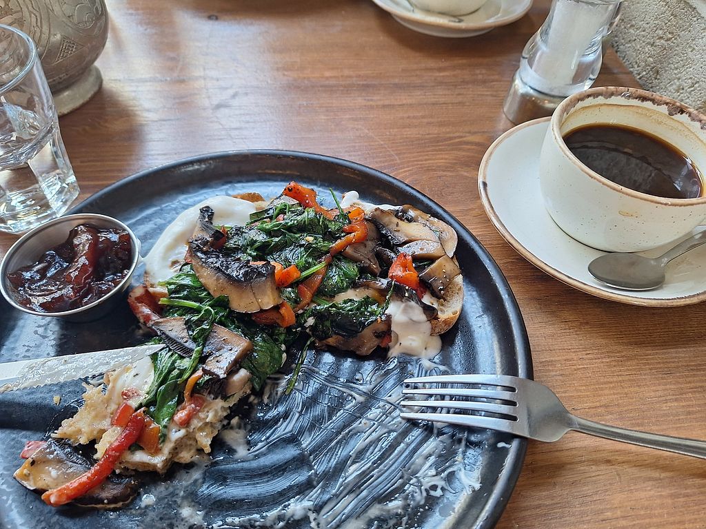 Read moreVegan on toast was 2 slices of artisan bread, a lovely creamy cheeze spread and loaded with garlic mushrooms, peppers and spinach. Really enjoyed it and good portion size!