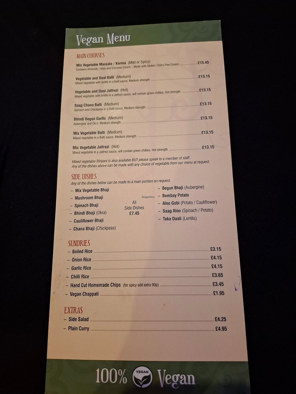 Never had a bad meal here. Now have a vegan menu too and staff very helpful at discussing ingredients etc. Would be even better if they could add a few starters and the popadoms to the vegan menu!