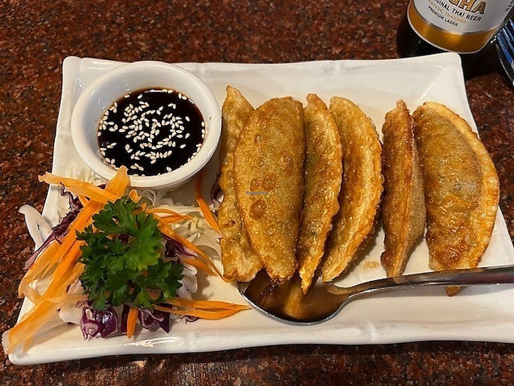 Serves meat, vegan options available. Thai restaurant with a separate menu section for vegetarian dishes, many of which are also vegan. Choices include golden tofu, gyoza, edamame, pad Thai, and fried rice. Also has vegan Thai coffee and tea. Open Mon-Fri 11:00am-3:00pm, Mon-Thu 5:00pm-9:00pm, Fri 5:00pm-9:30pm, Sat 11:30am-9:30pm, Sun 11:30am-8:30pm.