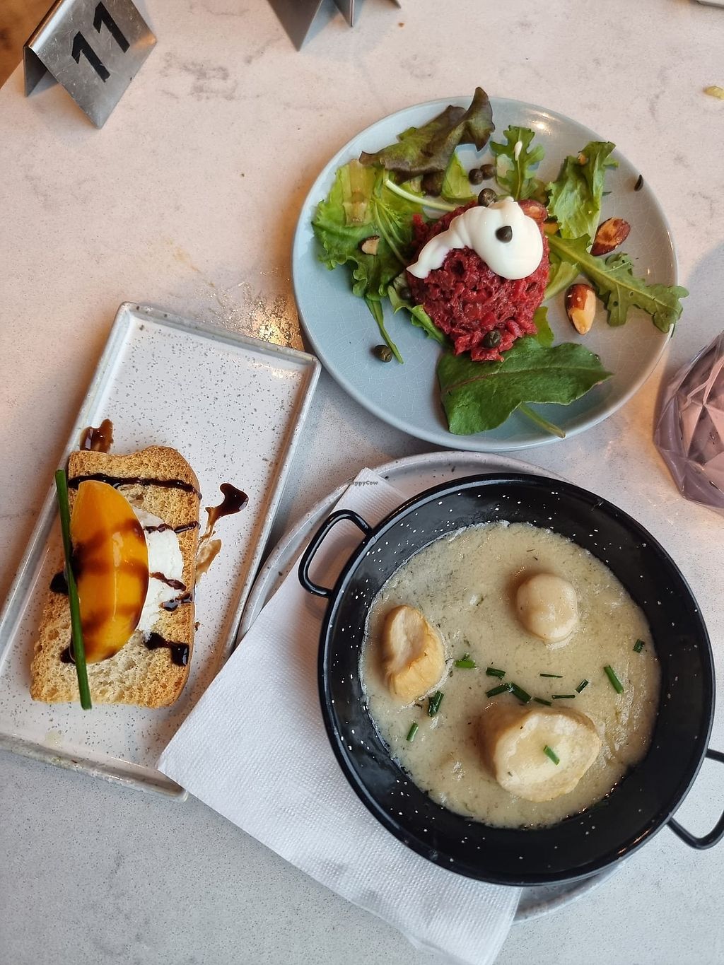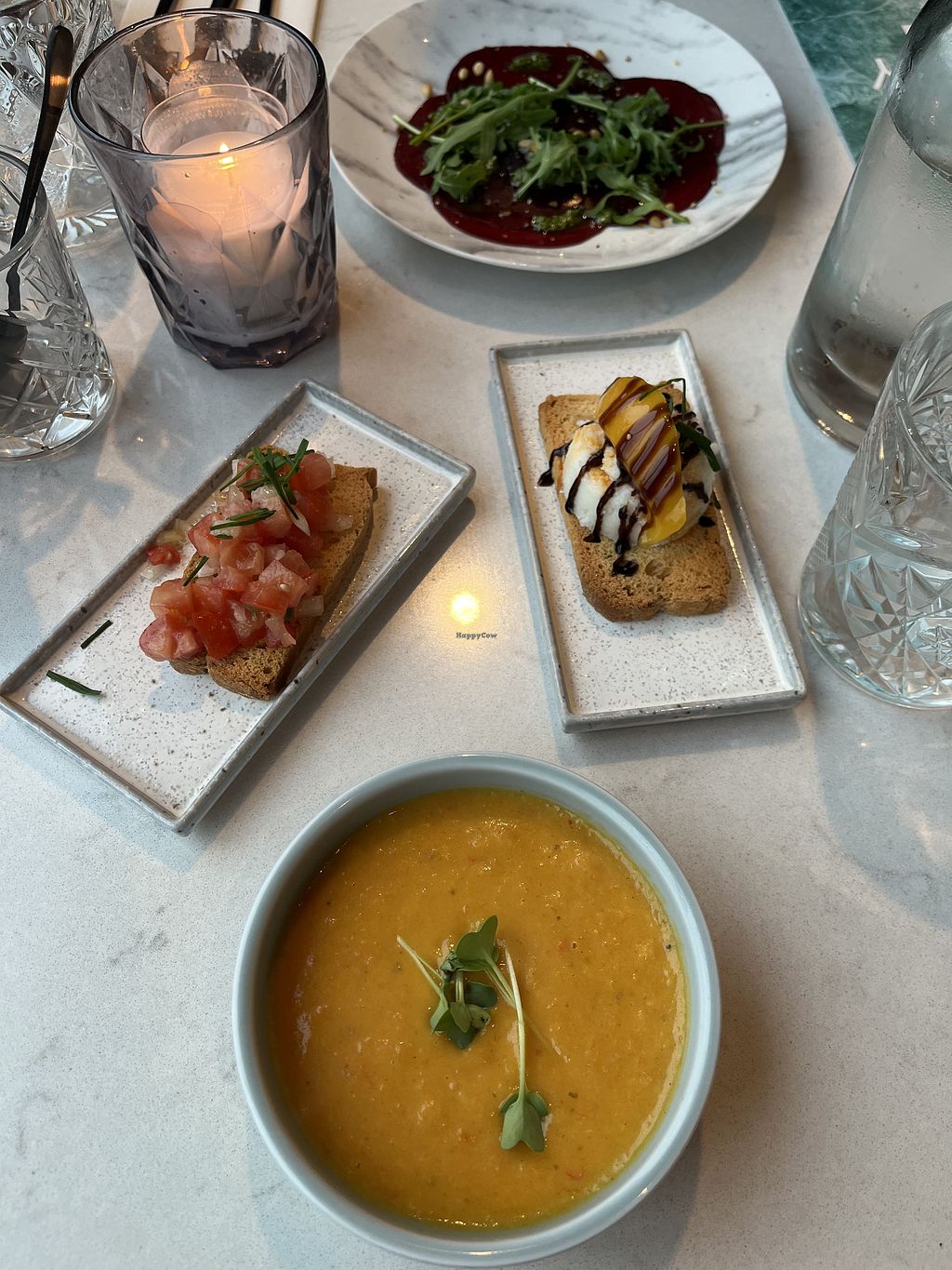 Carrot coconut soup, two kinds of bruschetta and beetroot carpaccio