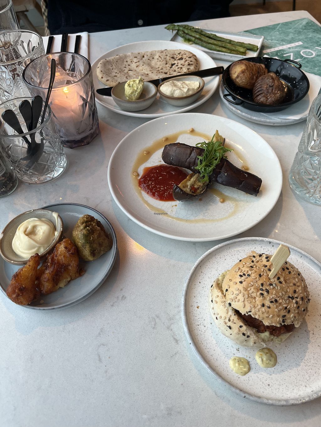 Slider / mini burger, pakora, fried eggplant, flatbread with hummus, p…