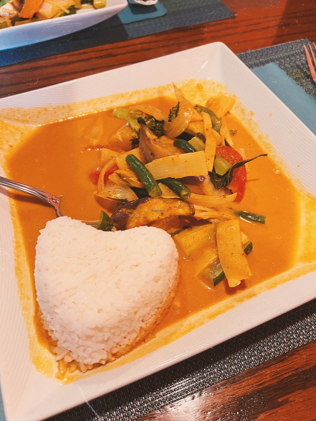 We went on a Saturday night and the waiter was a bit flustered, but he got it together and the food came out pretty fast after the appetizer. Ordered the spring rolls which were deep fried, not necessarily my fav but they were pretty good. Many vegan options, the Pa Nang Curry was super tasty. And there were carrots in the shape of a butterfly on my plate. That's always a win in my book.