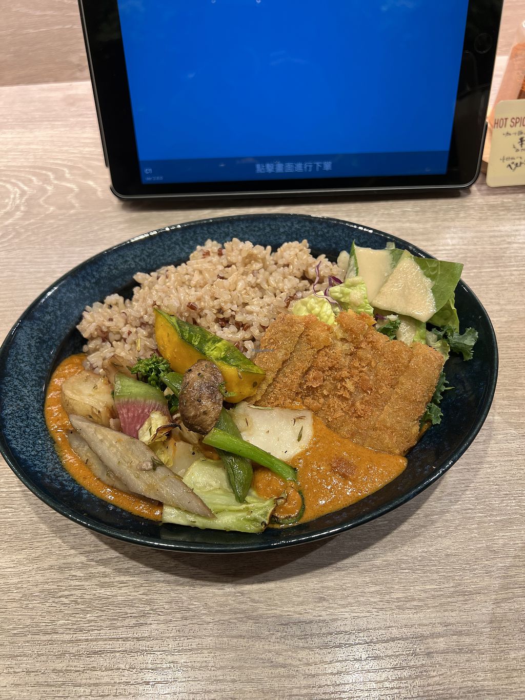 Vegan Curry with Rice, Vegetables, Vegan Scrambled Eggs & Vegan Breade…