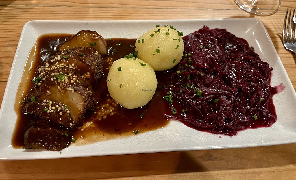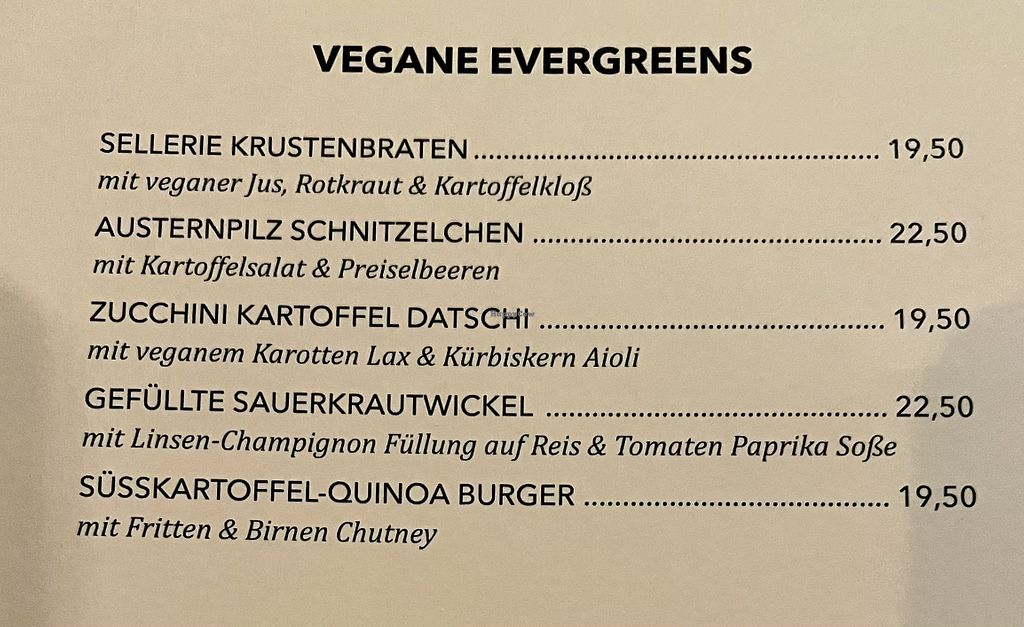 Serves meat, vegan options available. German restaurant with vegan choices. Menu is clearly labeled and offers cabbage mango and brussels sprout pear salads, oyster mushroom schnitzel with potato, celery roast with dumplings and more. Open Wed-Sat 17:30-23:00, Sun 14:00-22:00. Closed Mon-Tue.