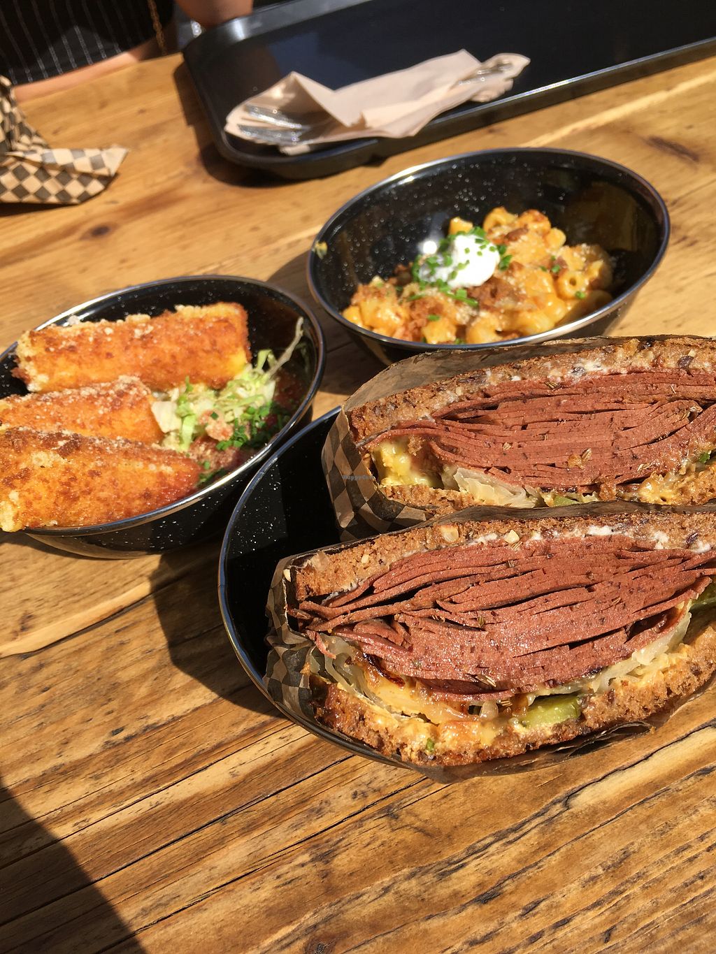 Reuben sandwich, mozzarella sticks, mac and cheese