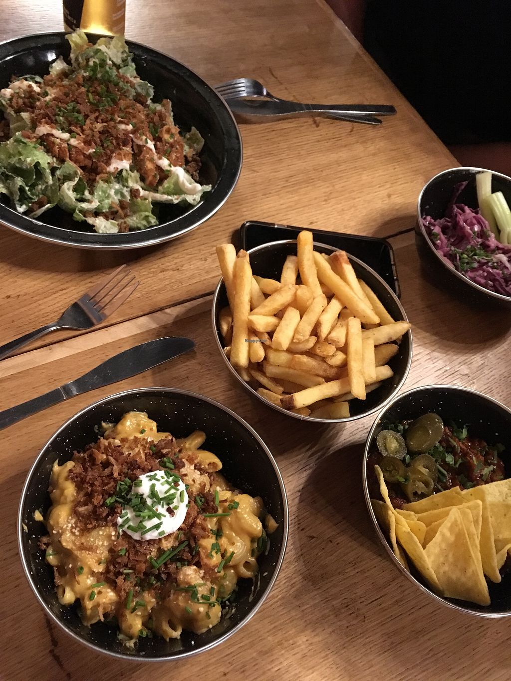 Caesar salad, mac n cheese, chips, chili bowl, slaw