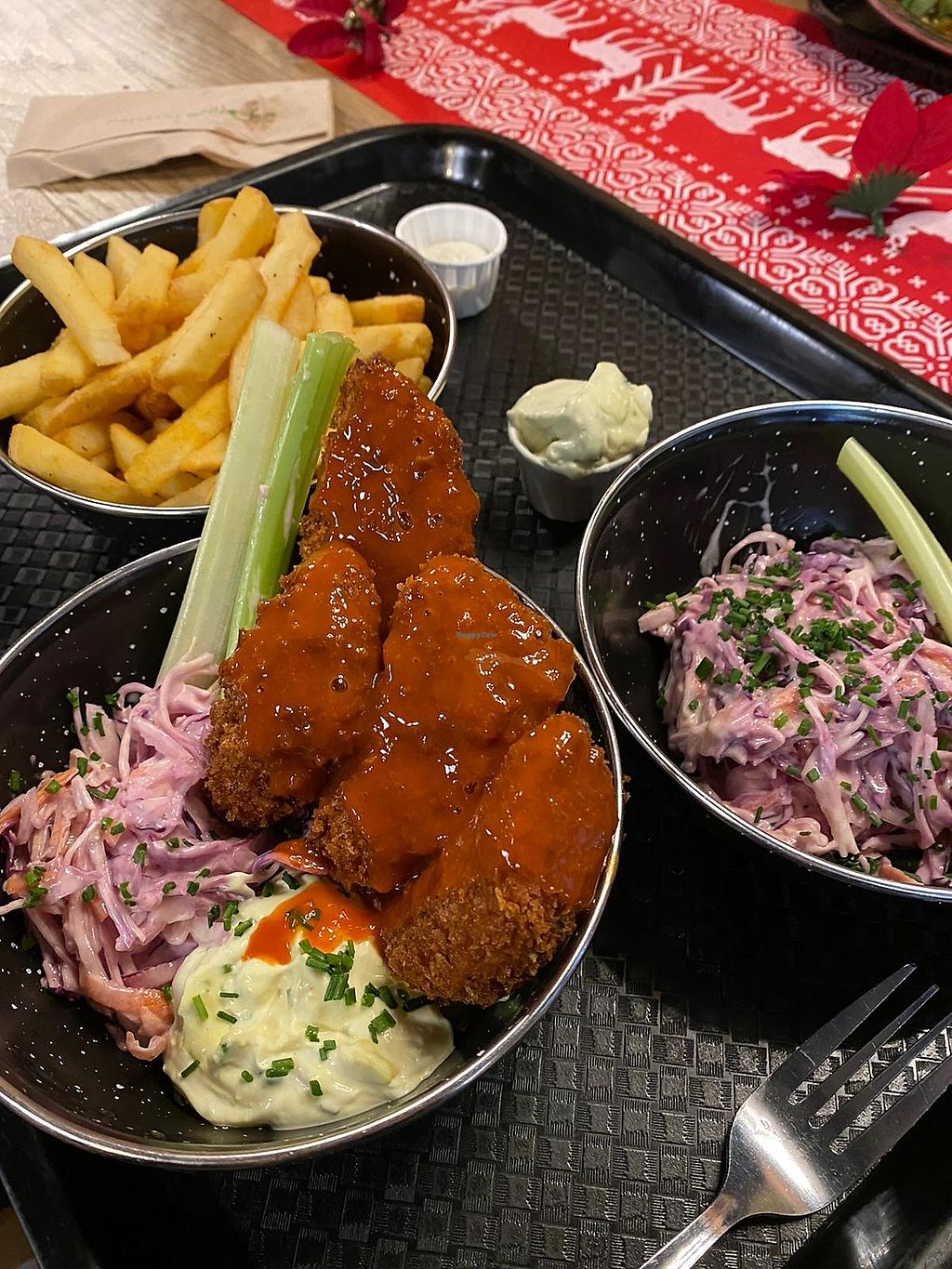 Buffalo wings, coleslaw and fries