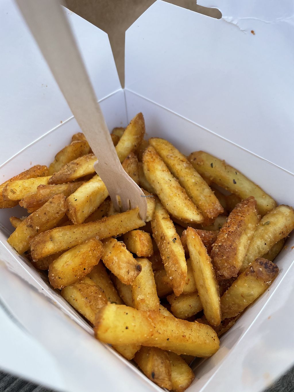 Rudy's Fries with garlic mayo and Buffalo Wingz