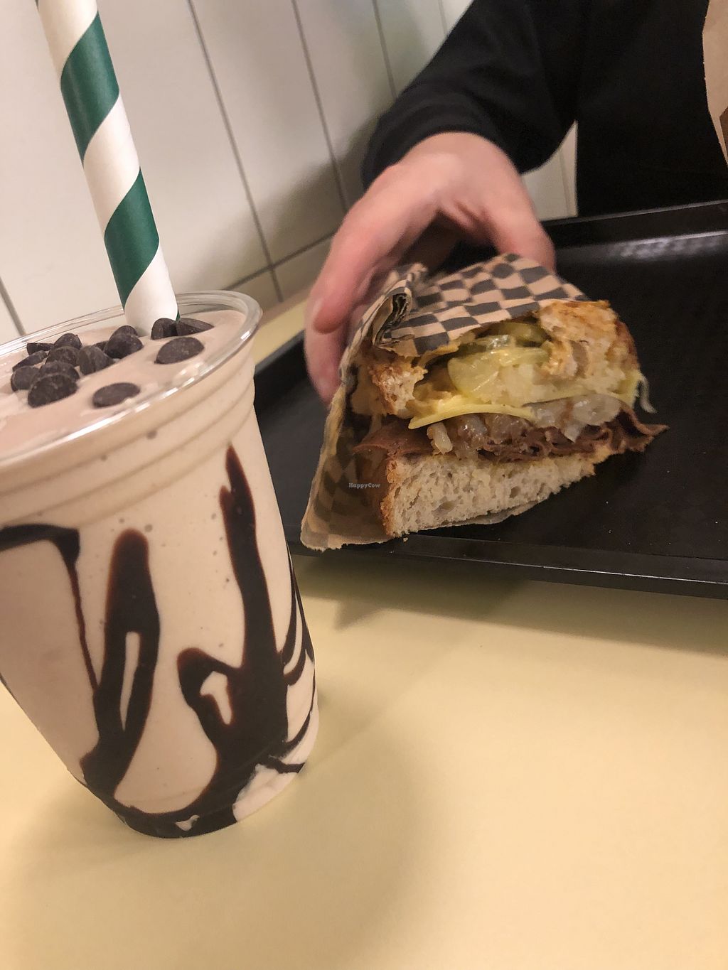 Mozzarella sticks, reuben sandwich and chocolate /mint milkshake