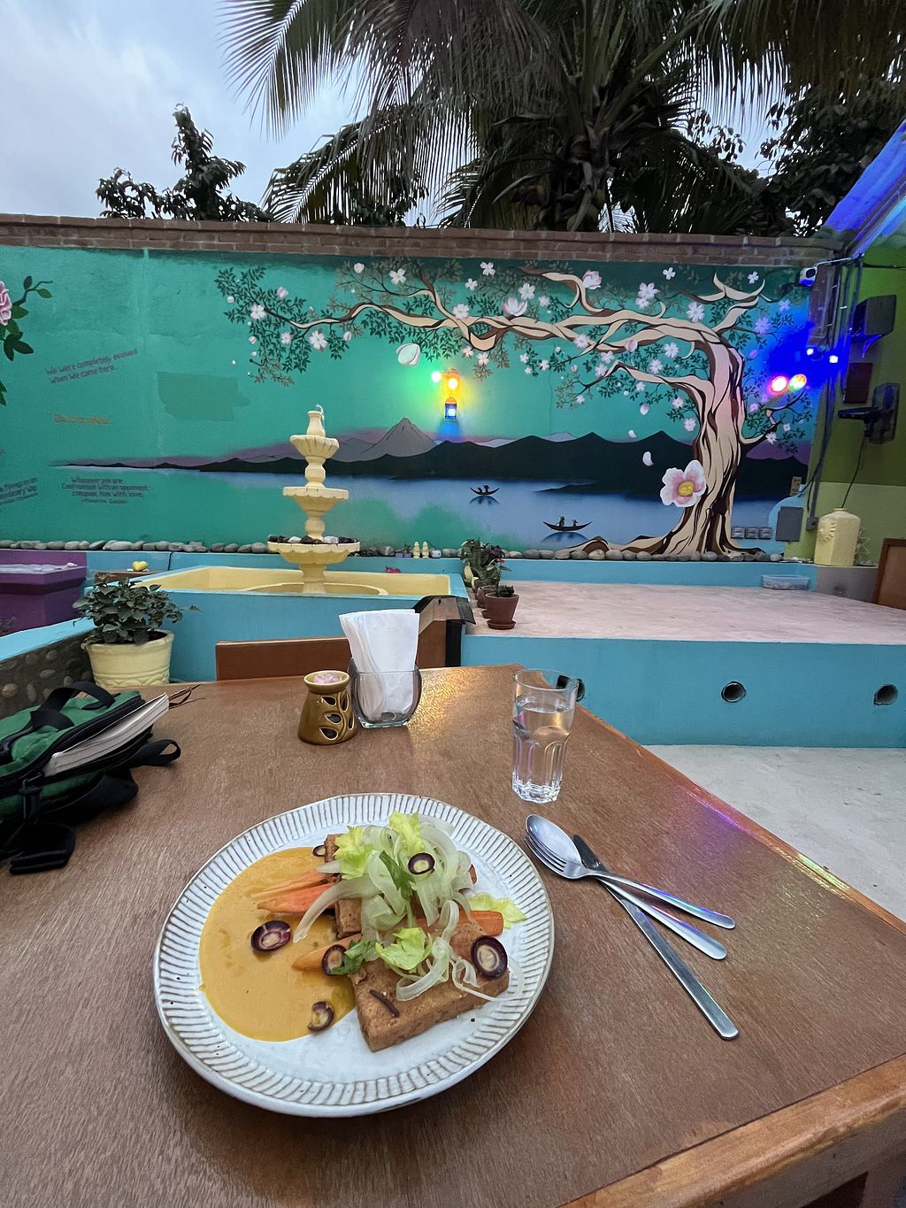 This restaurant was welcoming and peaceful. Every dish can be made vegetarian or vegan and are good sized, healthy portions. The fresh rolls were delicious and we enjoyed the curries. It was a tranquil place and we enjoyed relaxing and cooling down from the sun while enjoying our delicious meal. The service was excellent and friendly.