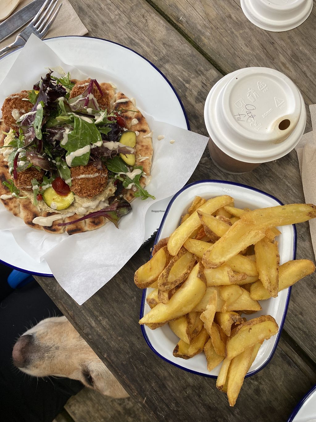 Pakoras and salad & oat milk cappuccino