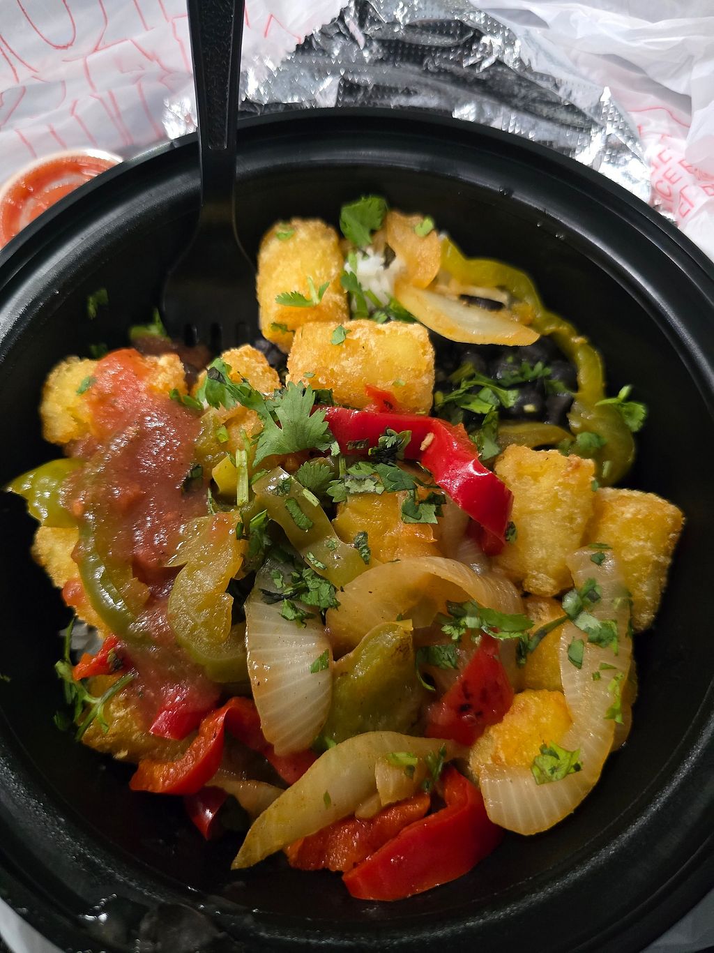 Staff was friendly and made suggestion to get veggie fajita bowl without dairy (queso fresco, baja sauce). I added salsa (free) and a tortilla ($1). It already includes tater tots, which gave it a nice breakfast feel. Much more flavor than expected, and thoroughly satisfying.