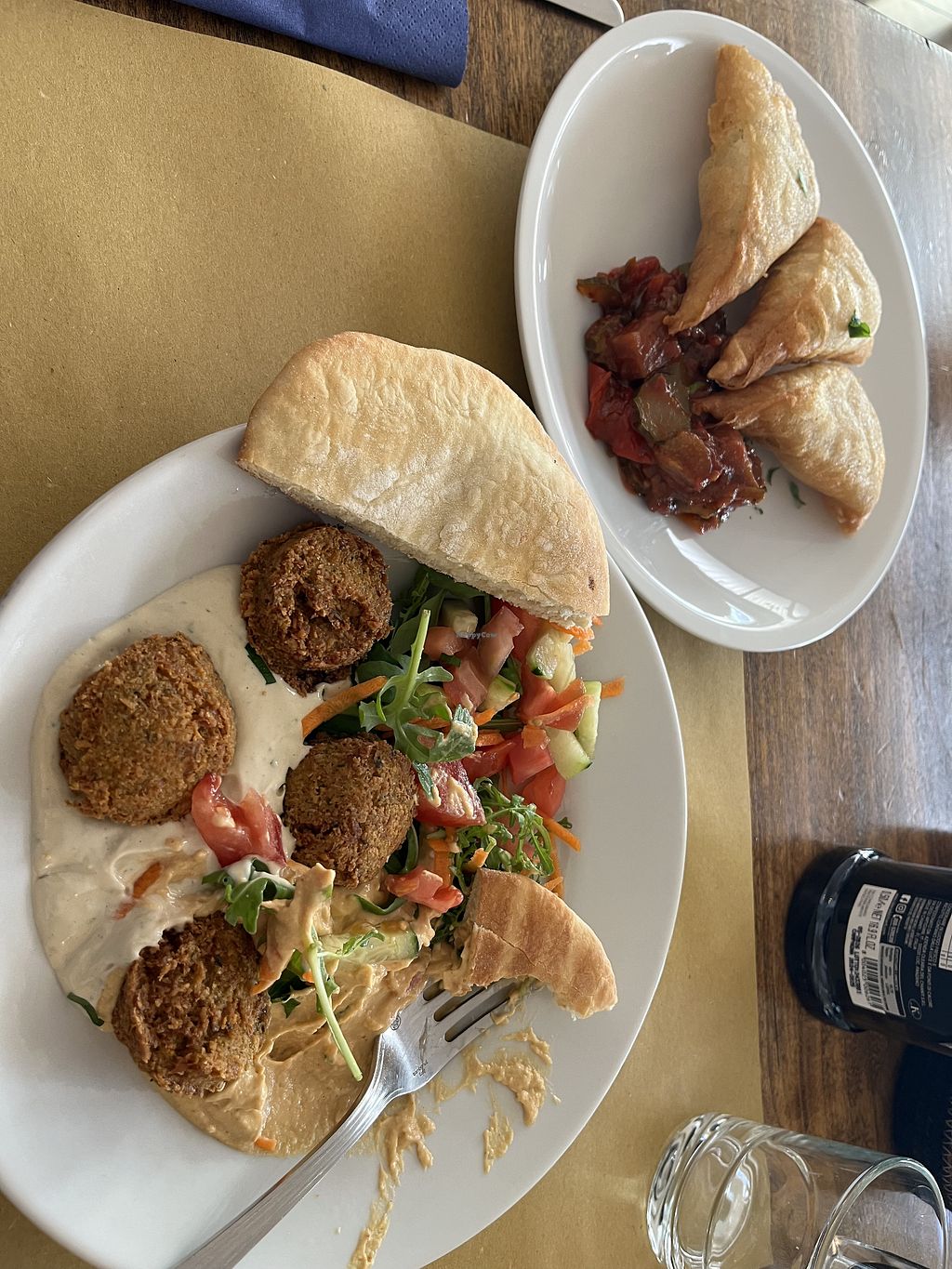 Veggie platter with potato boreka, fried artichoke, tahini, hummus, fa…