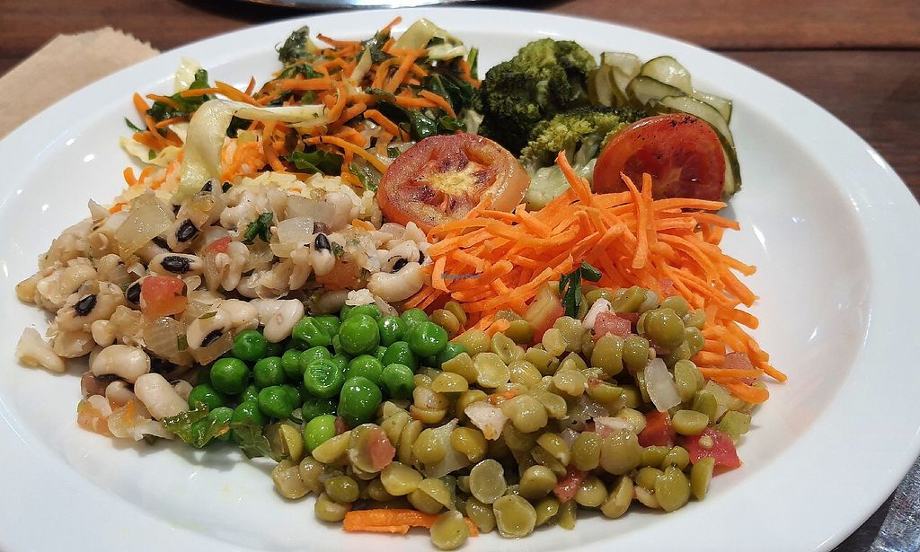 Buffet de comida por kilo. Muitas opções de salada. Entre as opções quentes, comidas que são naturalmente veganas como arroz, feijão, couve, legumes e abóbora refogados, batata e macaxeira frita.
