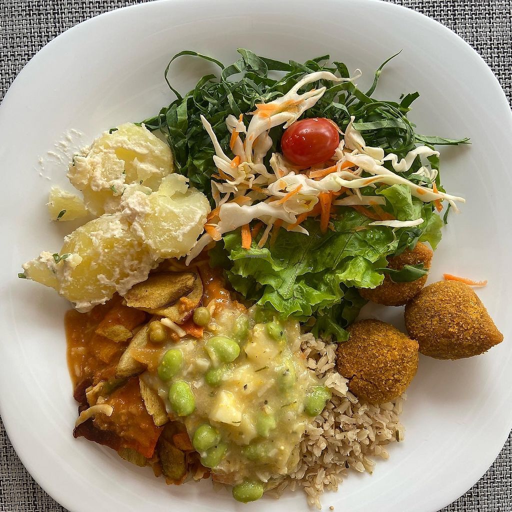 100% vegan self-service buffet with varying daily options.