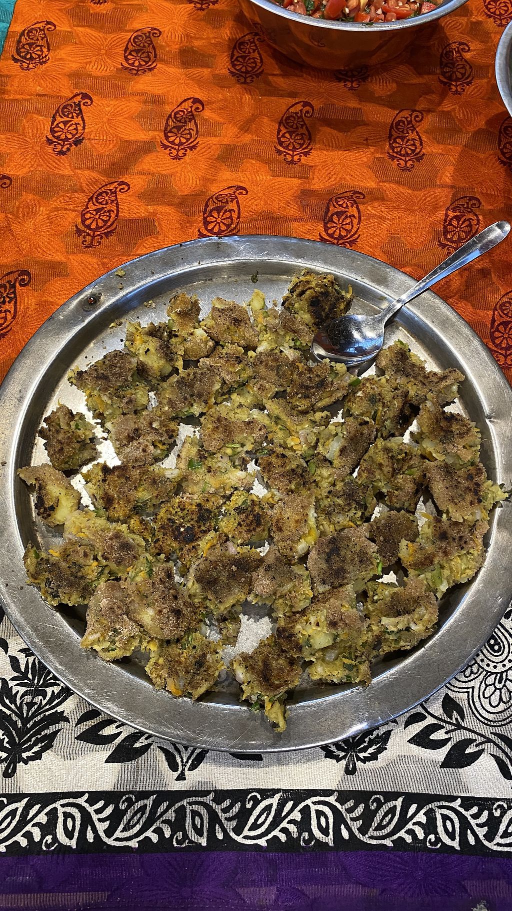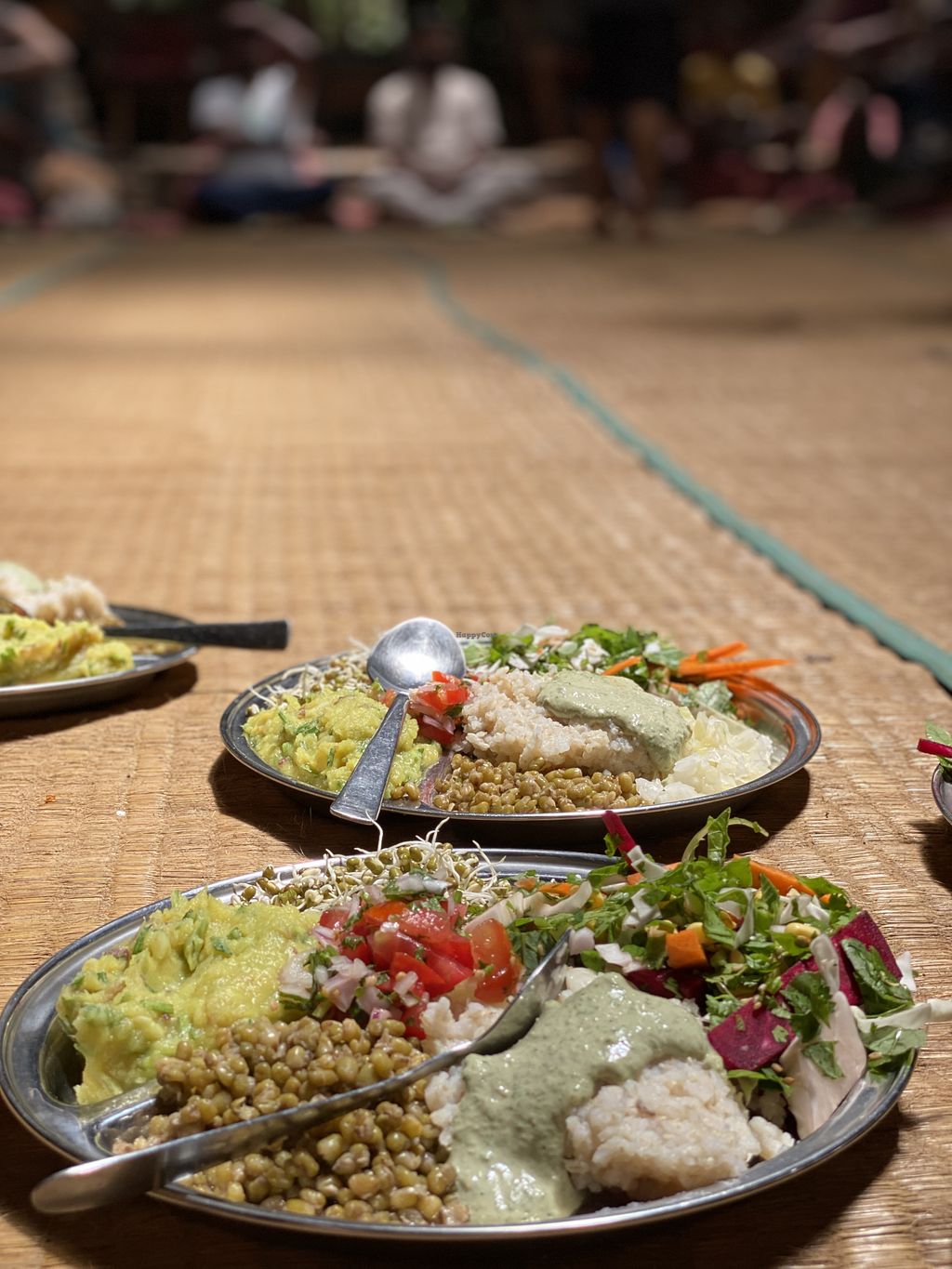 Delicious meals shared with anyone who happens to drop in. Also, free vegan chai and laddus at their tea hut. 🛖