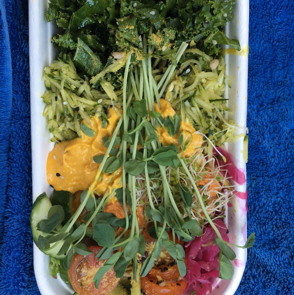 Beautiful food always hits the spot excellent hearty raw vegan food. Worth the price because it is all organic! artistically presented !