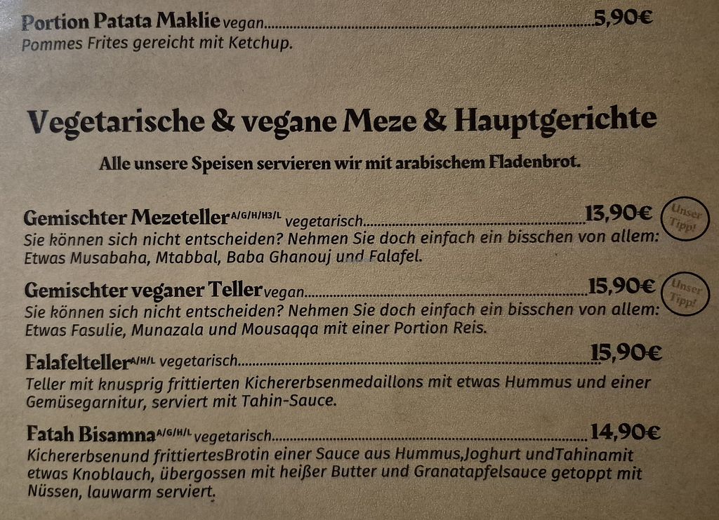 Fortunately for me, the word vegan is spelled the same in English and German and the vegan options here are very clearly marked as such. I had the Fatah Bisamna and Mousiqqa. Both were glorious