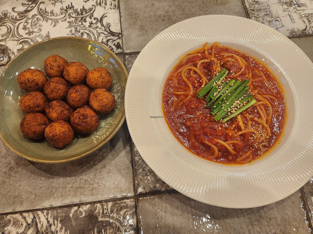 Tofu ball comes with simple light tomato sauce & crunch fried mushroom…