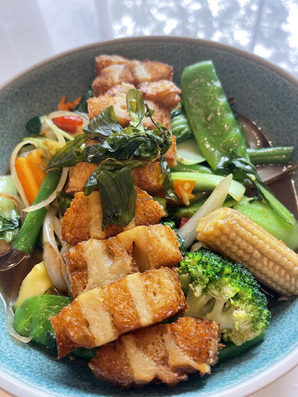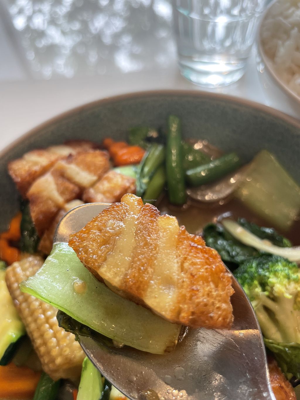 Pad med ma maung with vegan chicken and coconut rice