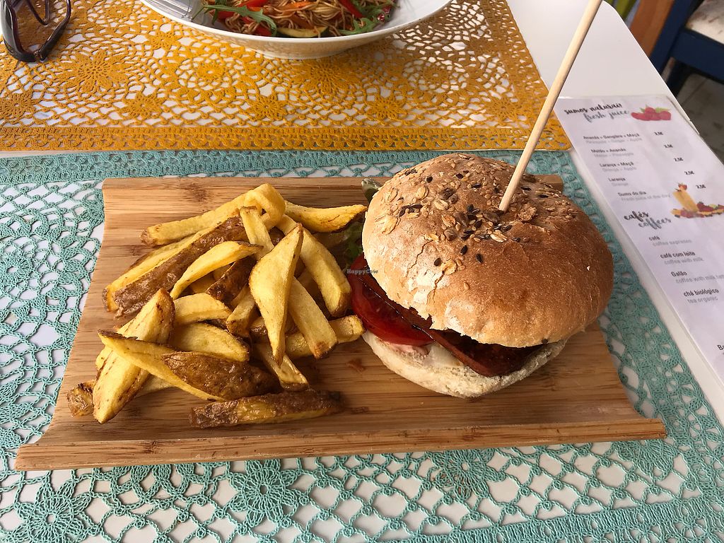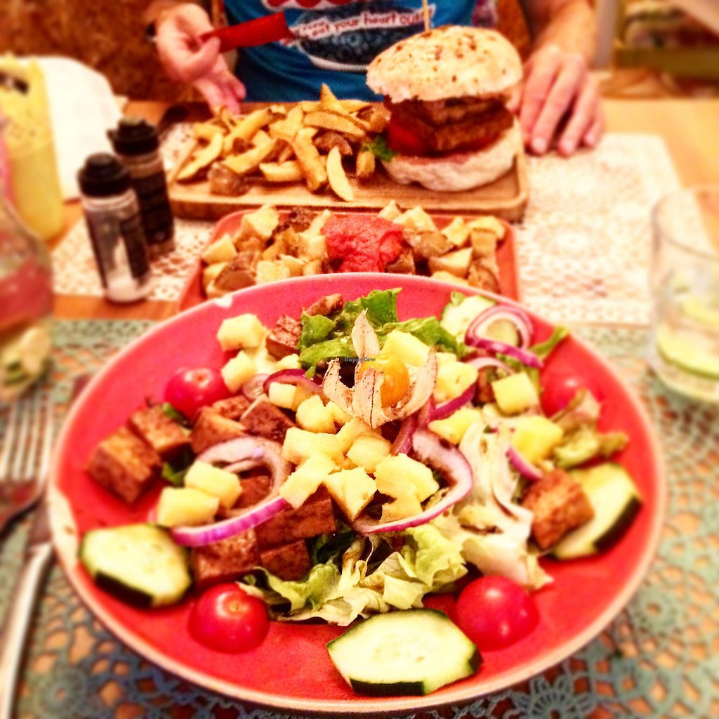 Tofu salad, batatas fritas and vegan burger