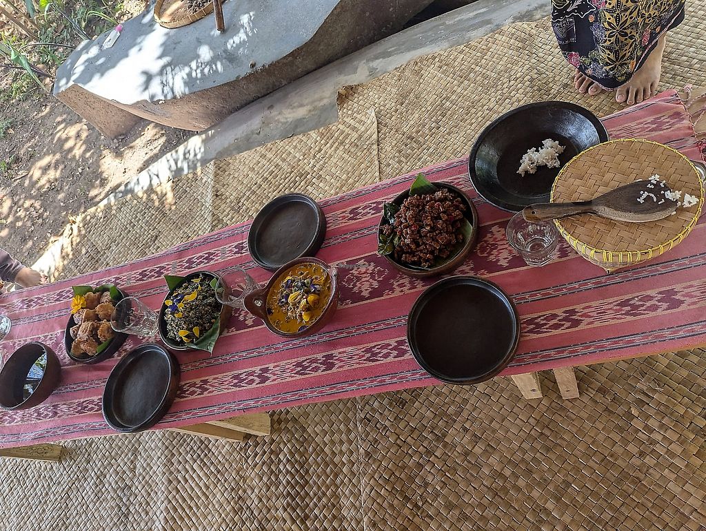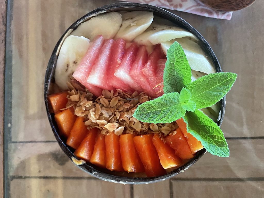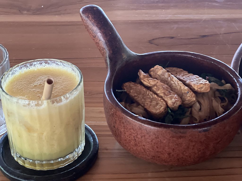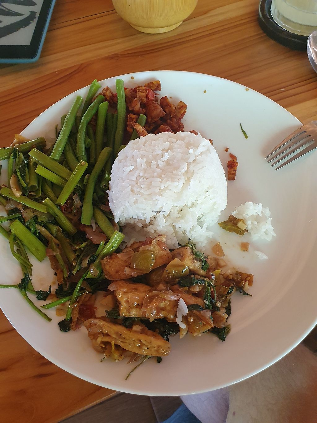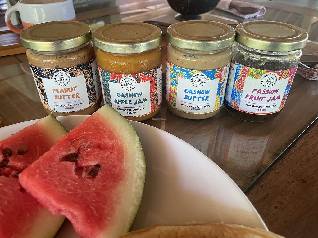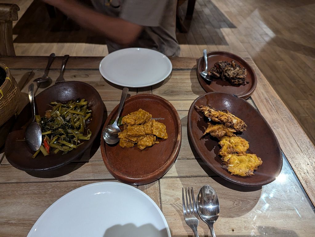 Farm-to-table type restaurant. Each meal is different and is written on a small black board. Every meal consists of two types of veggies served with tempe & tofu, rice. Will open for dinner upon reservation. Reported to use cow's milk and honey September 2024. Open Mon-Sun 8:00am-9:00pm.