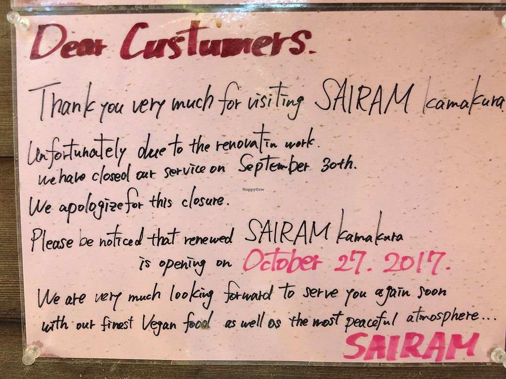 Wir haben am 10.06.2019 im Restaurant "Sairam" in Kamakura gegessen. Wir wurden freundlich vom Personal begrüßt und haben einen Tisch auf der Terasse (mit Blick auf das Meer) bekommen. Das Restaurant ist sauber und nett eingerichtet. Das Personal hat uns das vegane Buffet vorgestellt.