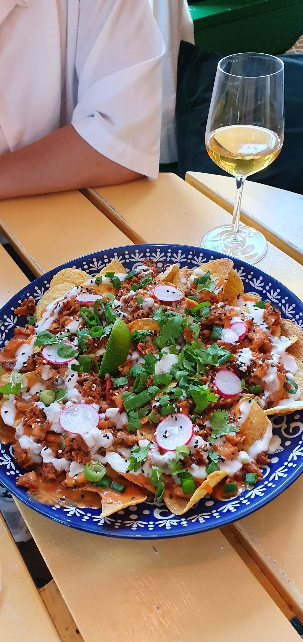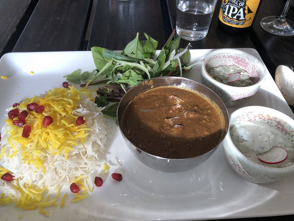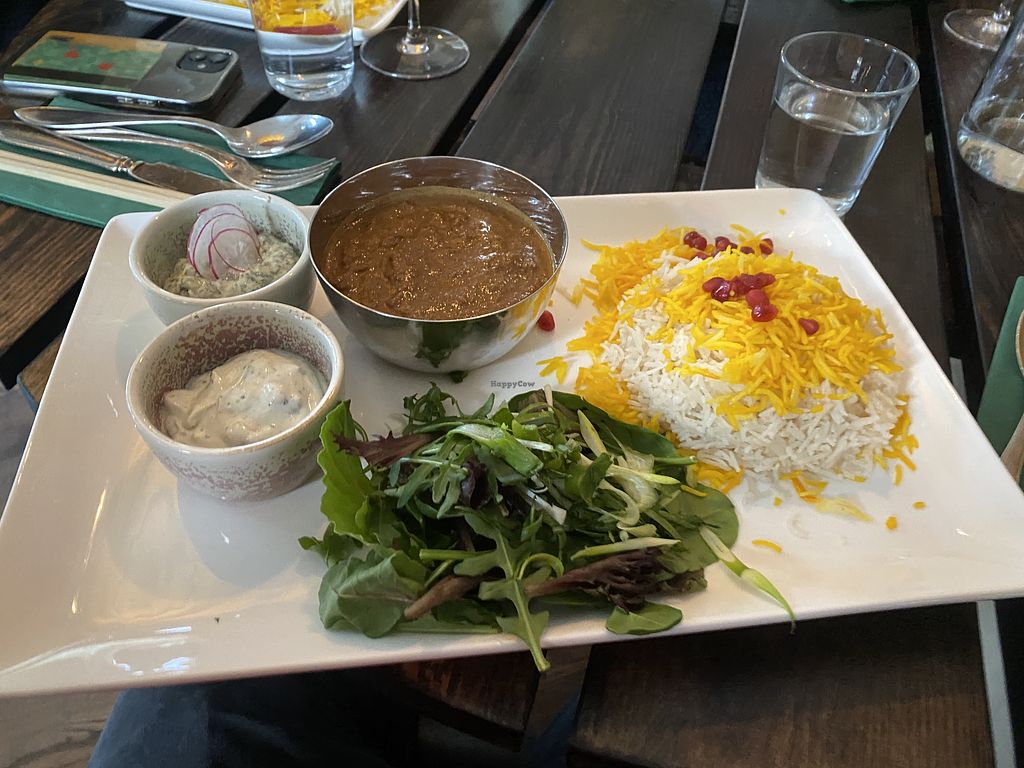 We ordered 3 things - the loaded nachos as a starter, and then the fesenjoon and katsu burger as mains. The starter was so good - both crispy, tangy and umami heavy. Me and my boyfriend loved it. I had the fesenjoon which was very sweet but good. I'm personally not the biggest fan of sweet food, but when I'd gotten used to it I found my self liking it and the stew, saffron rice and dips to be a good combination, and I finished almost all of the plate. The katsu burger was unfortunately not very good, as the patty was stodgy and lacked in flavour, and the potato wedges didn't really work with the panko coating. I would like to visit this place some other time to try their other dishes, since I feel like this restaurant overall have well made and delicious dishes. I strongly recommend to try the loaded nachos (and the fesenjoon, if you like sweet food). The servers and ambiance were nice, it's great that the whole restaurant is vegan and we had a good time while visiting.
