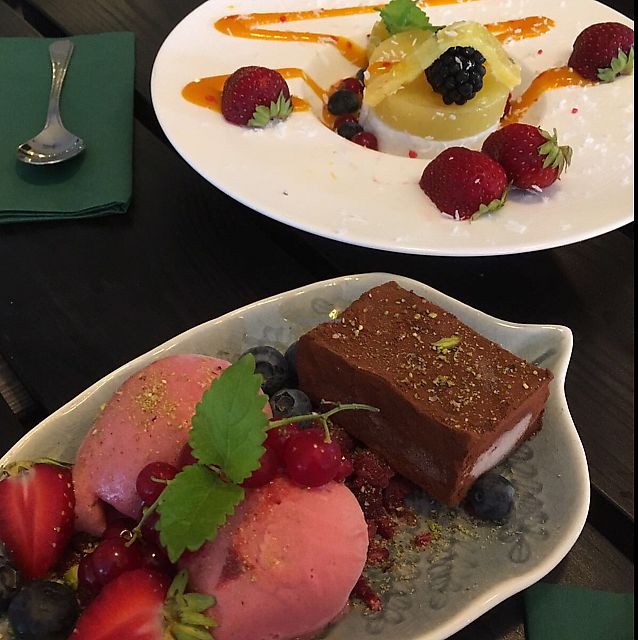 Good variety of vegan main plates. Cozy atmosphere. Small variety and not astonishing desserts.