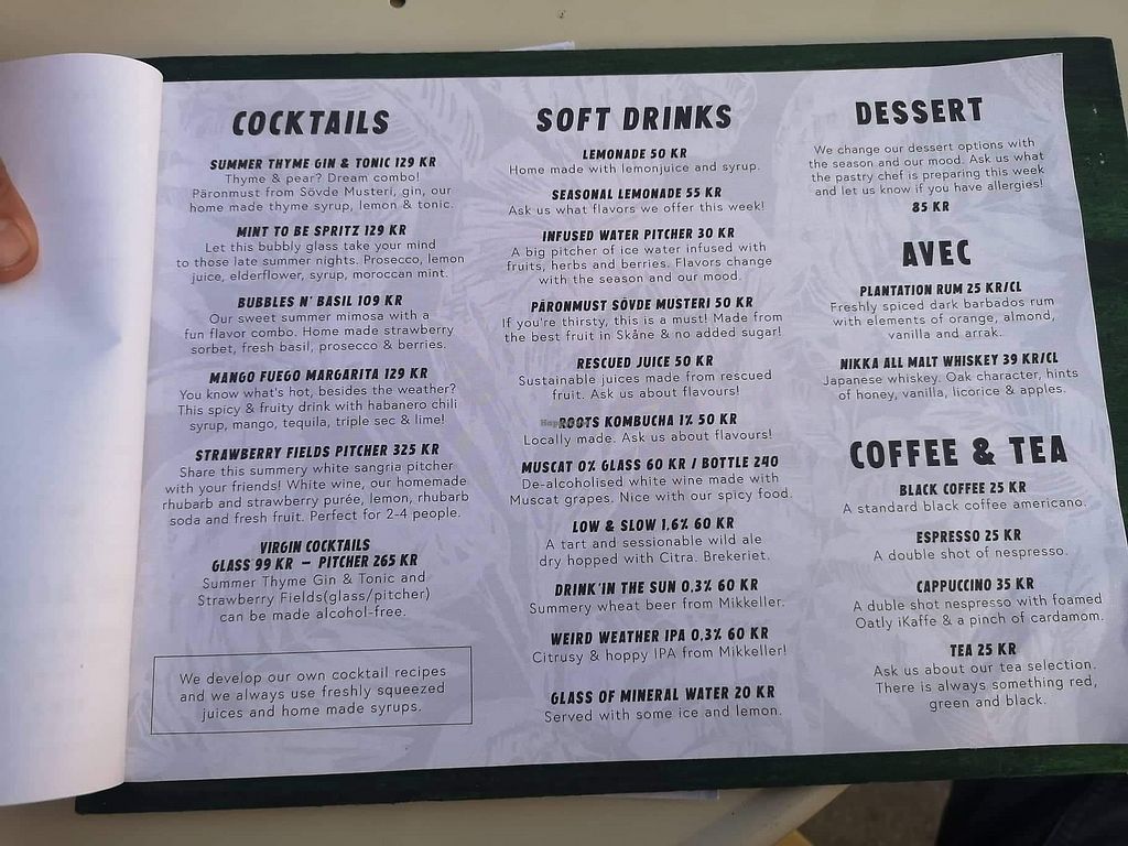 A nice and varied menu with for example burger, curry stew, salads, and more. A good selection of non-alcoholic beverages, an innovative cocktail and drinks, and lovely orange wines