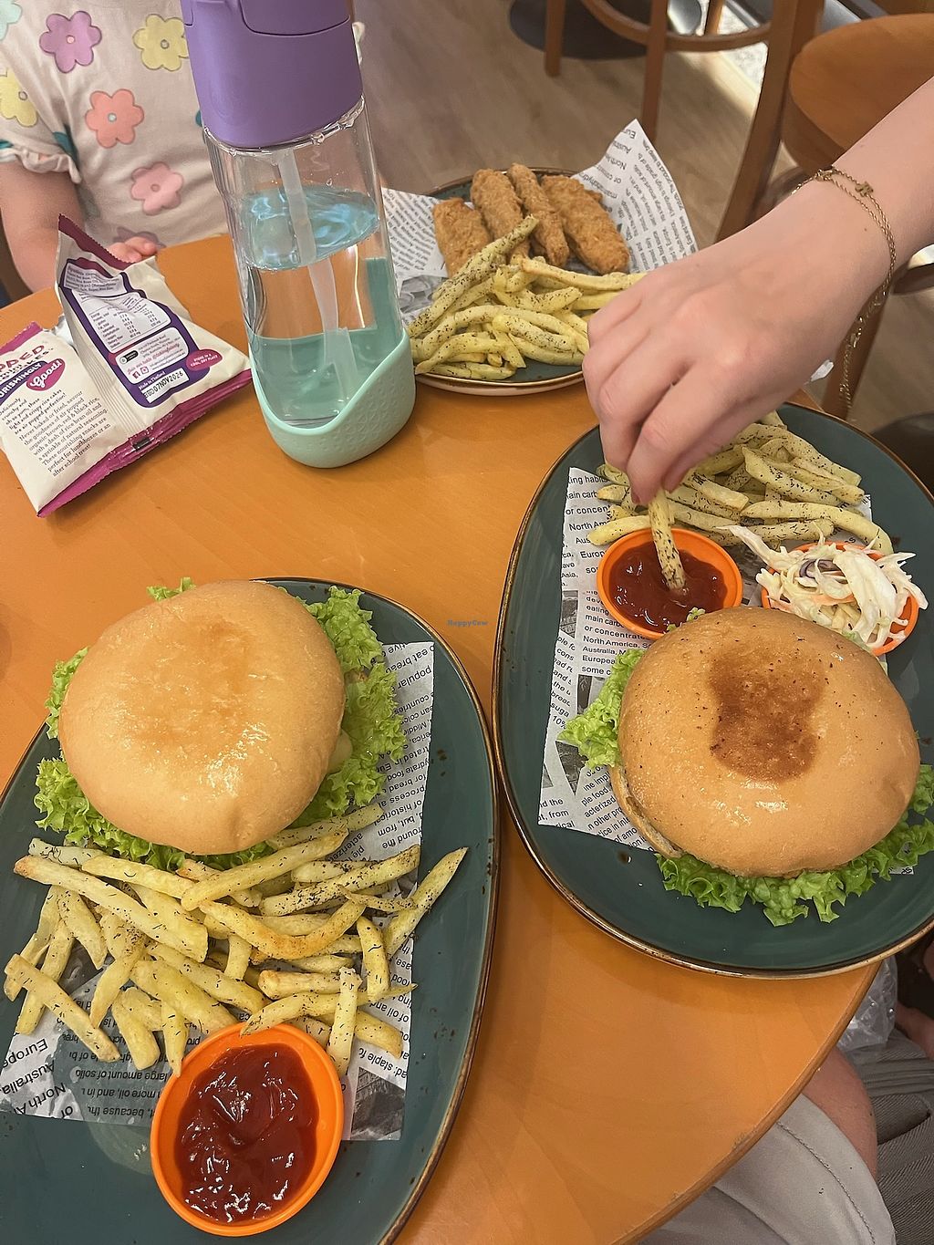 Vegan chicken burger with fries and a small salad