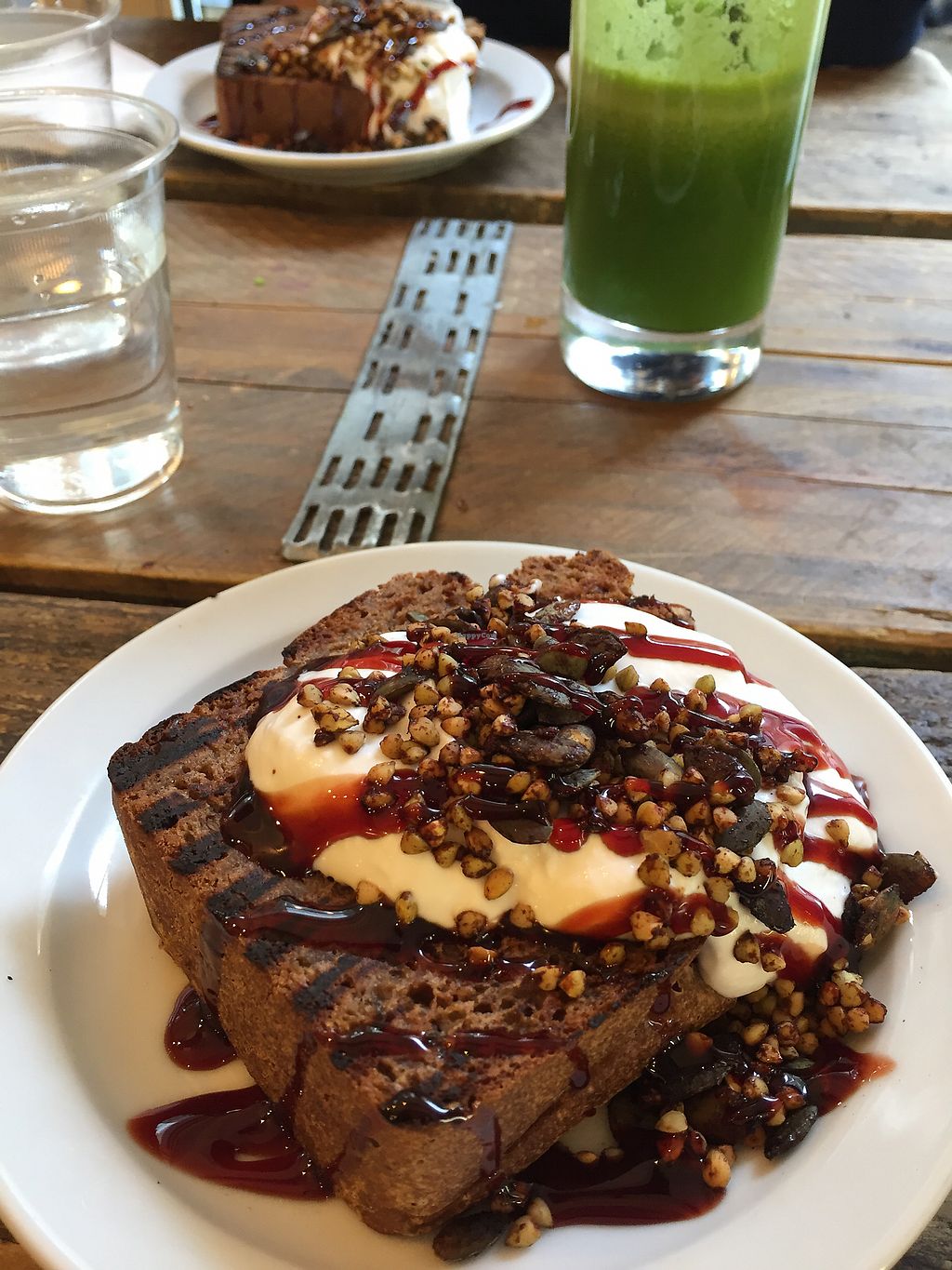 Black bean brownie and baked apple banana bread topped with coconut yo…
