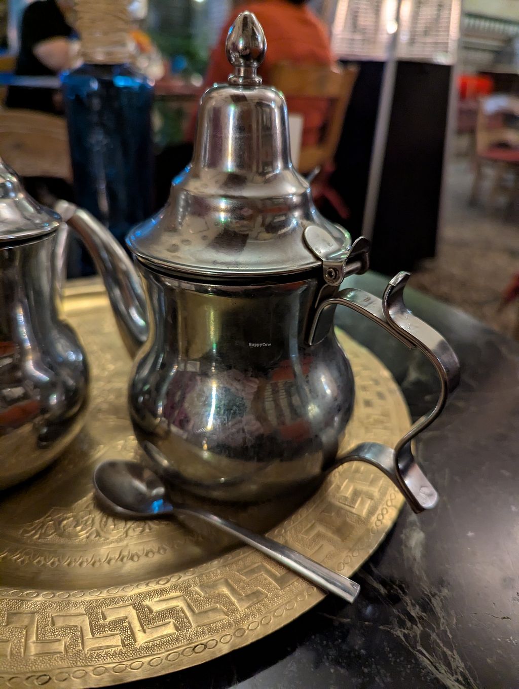 Went to this adorable place with my omni family for lunch and it did not disappoint!! The ambiance was really serene and beautiful. The menu has an amazing tea selection, as well as an abundance of flavorful vegan options (although they are not marked). Our waitress’ English was not perfect, so I don’t think the wait staff would be familiar with specific vegan requests. However, they have a lot of inherently vegan dishes (hummus, salad, veggie tagine), so I don’t think there’s any need to ask what’s vegan and what isn’t.