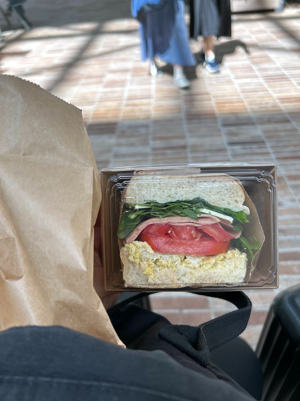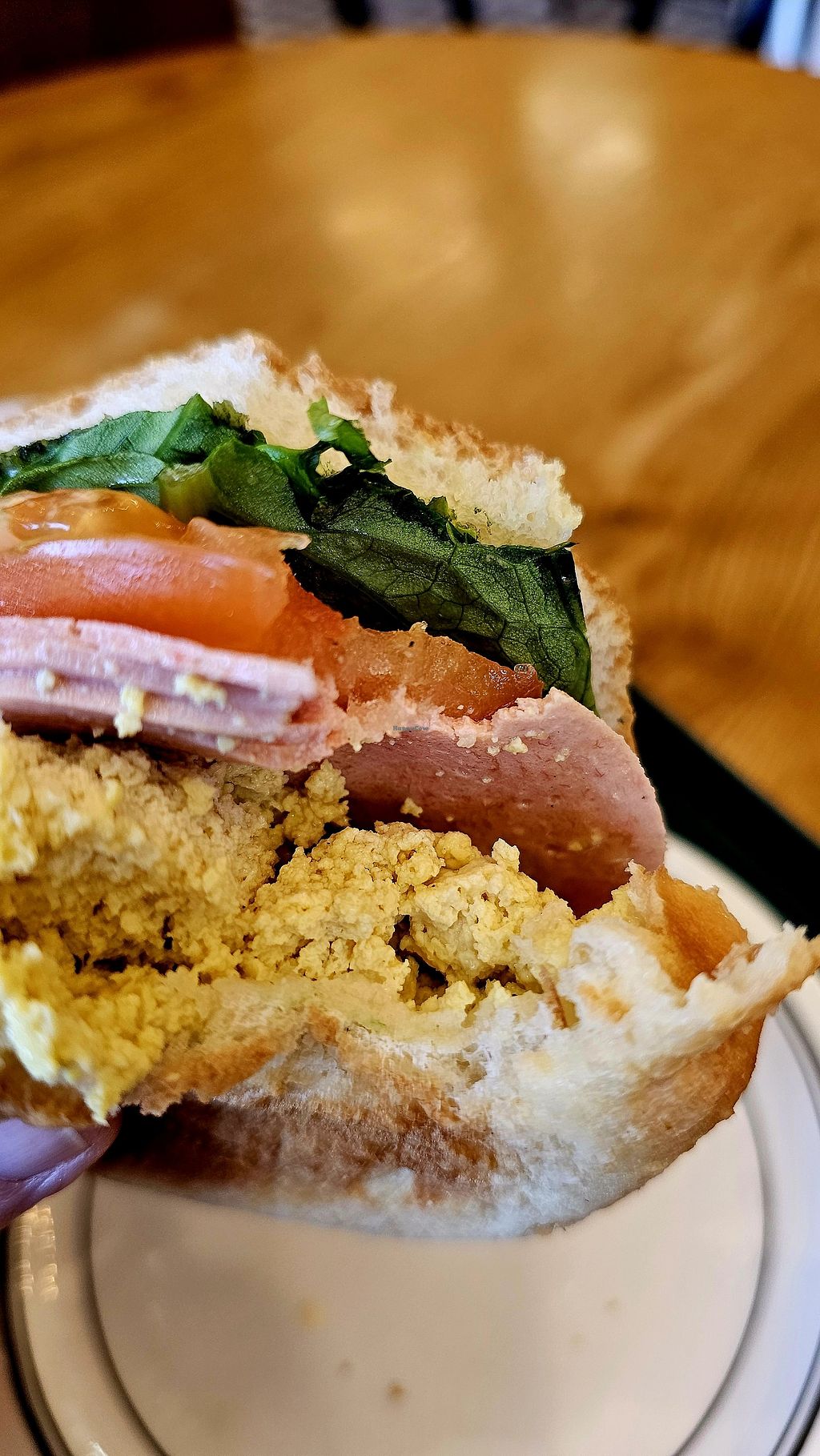 Sandwich with vegan ham, scrambled tofu, tomato and lettuce. It was good but it would have been better if it was warmed on a pan or grilled.