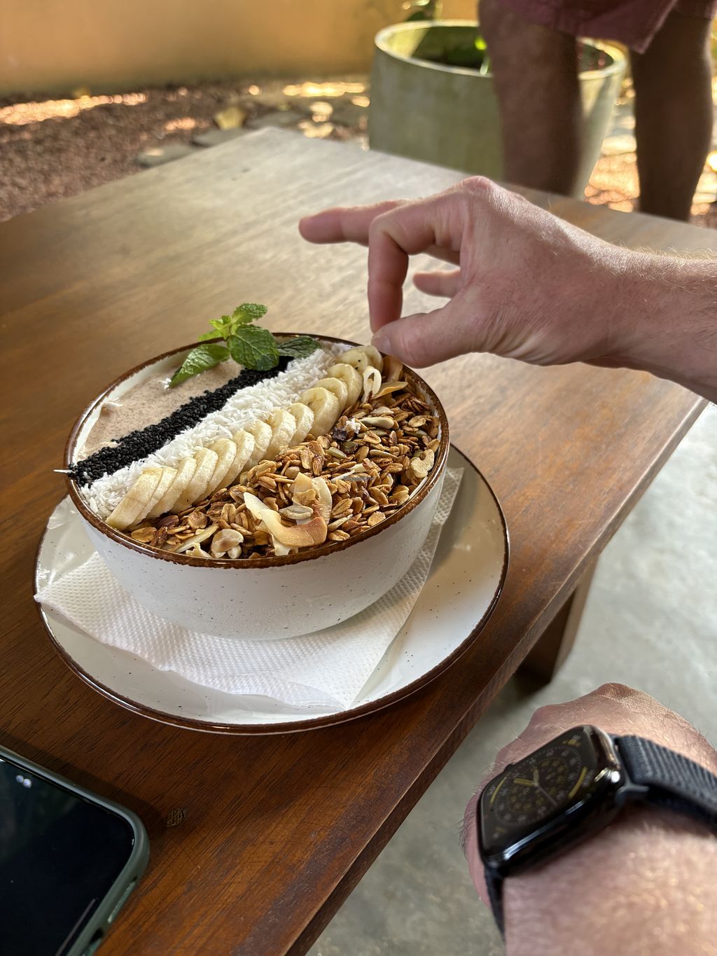 Local porridge, fresh juice and coconut cappuccino with a view.