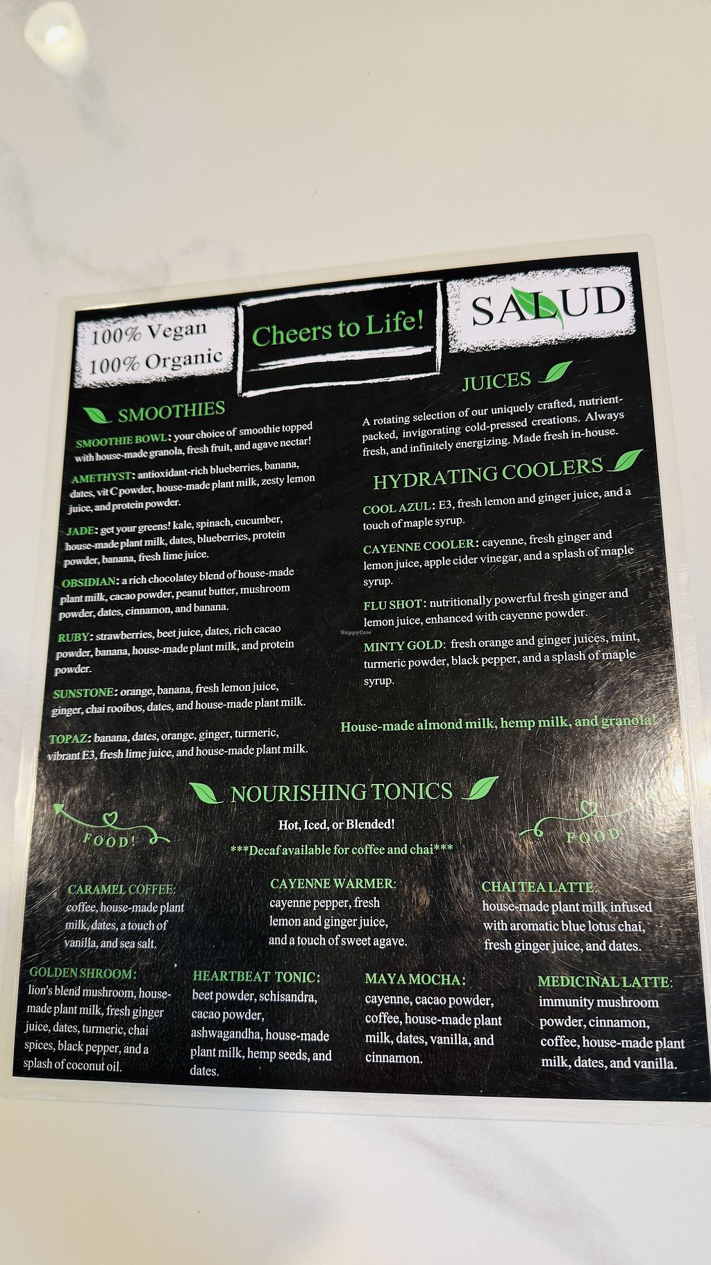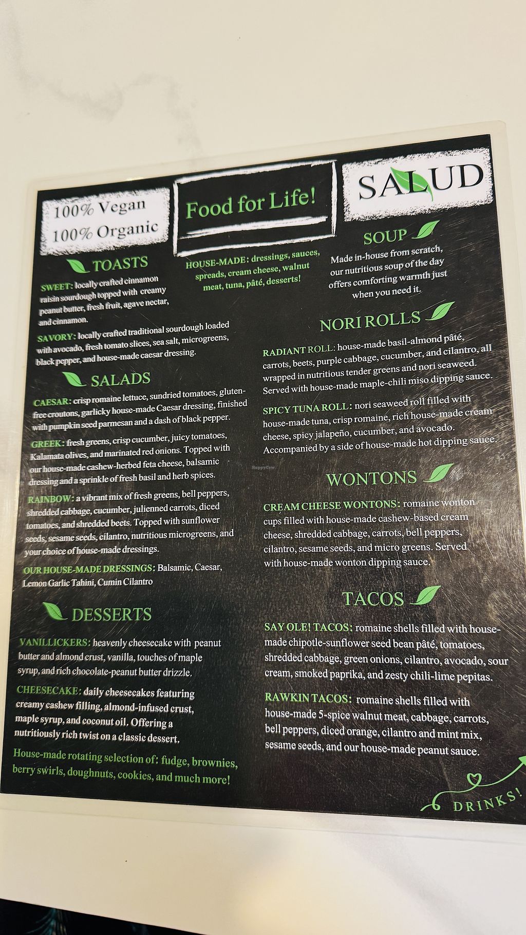 We loved Salud. I have some heart disease and try to adhere to a whole food, plant-based diet (Dr. Esselstyn's diet, or Forks Over Knives). It's really tough when eating out or traveling, but Salud makes many raw vegan options and does not use oils or processed foods of any kind. The food was delicious and filling, and the people were kind and helpful. I wish I had an option like this closer to home.