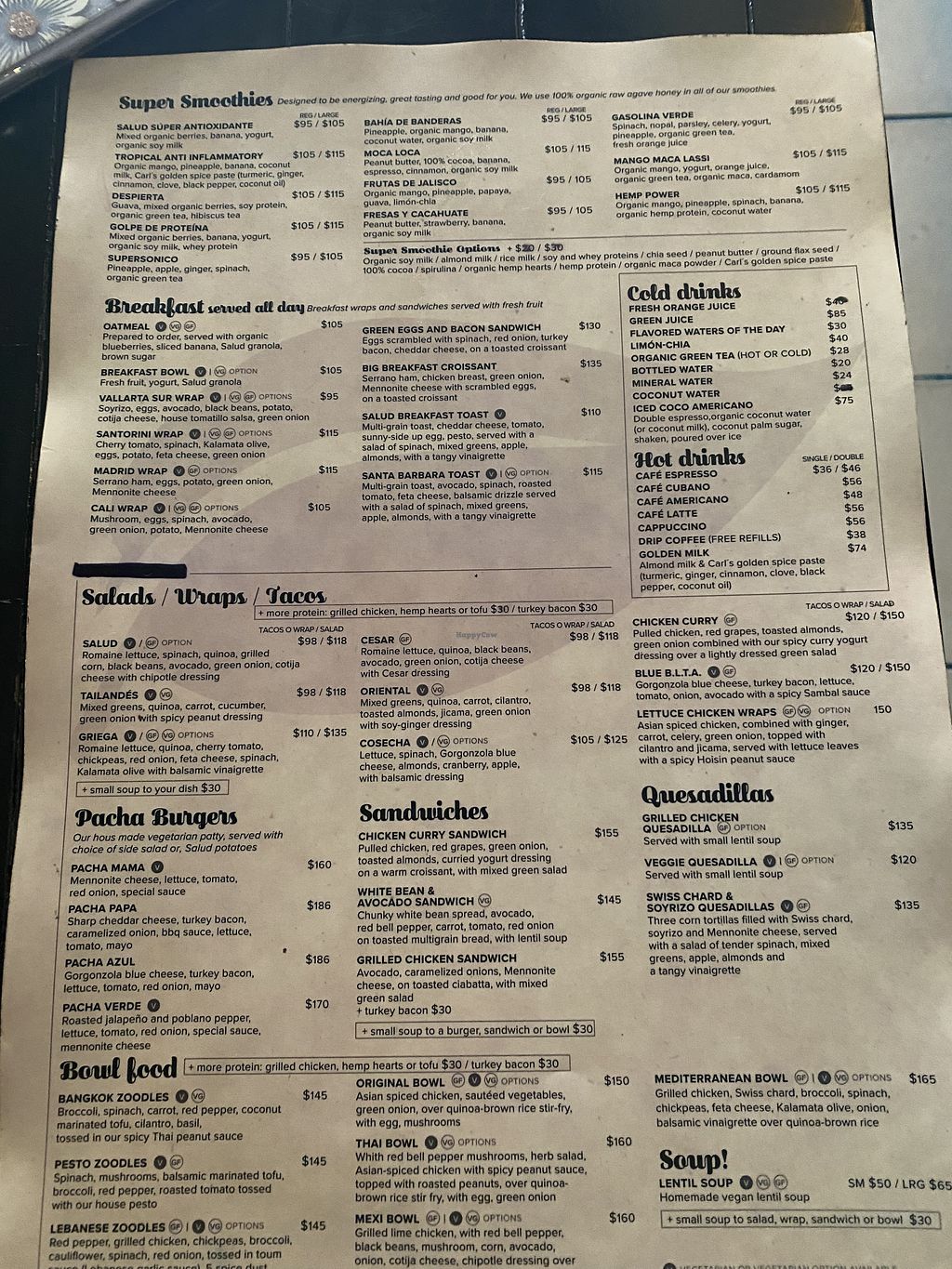 Dined here multiple times in a week. Tried to order a vegan burger. But was informed there is a small amount of cheese used in their patty. Not sure how that is vegan. Also discovered that the vegan Vallarta Sur Wrap is actually 15 pesos more due to tofu scramble, but cheese and egg are removed. 🤷♂️. Still a good value, though.