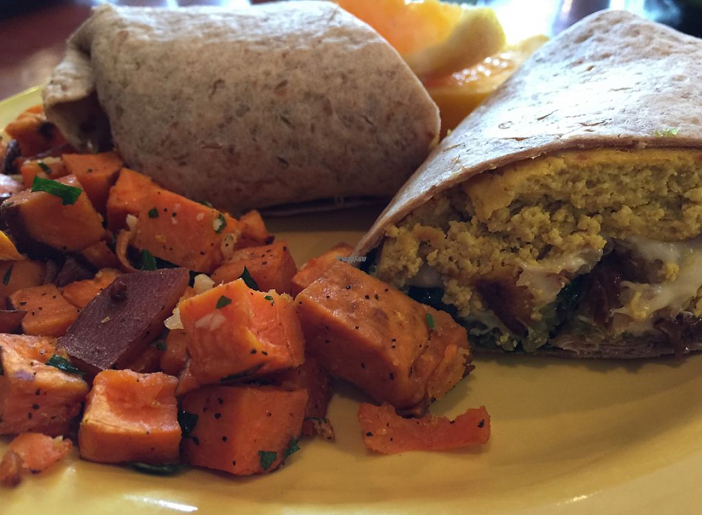vegan tofu scramble with daiya cheese breakfast wrap.