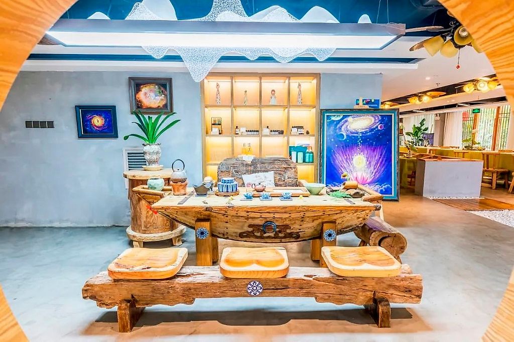 Raw vegan restaurant in a resort in Maofeng Mountain. Nothing is heated over 41C. At 广东省广州市白云区太和镇头陂桔洞行窿街16号. Raw options are soup, salad, wraps, sushi, cakes and smoothies. Reported closed January 2024.