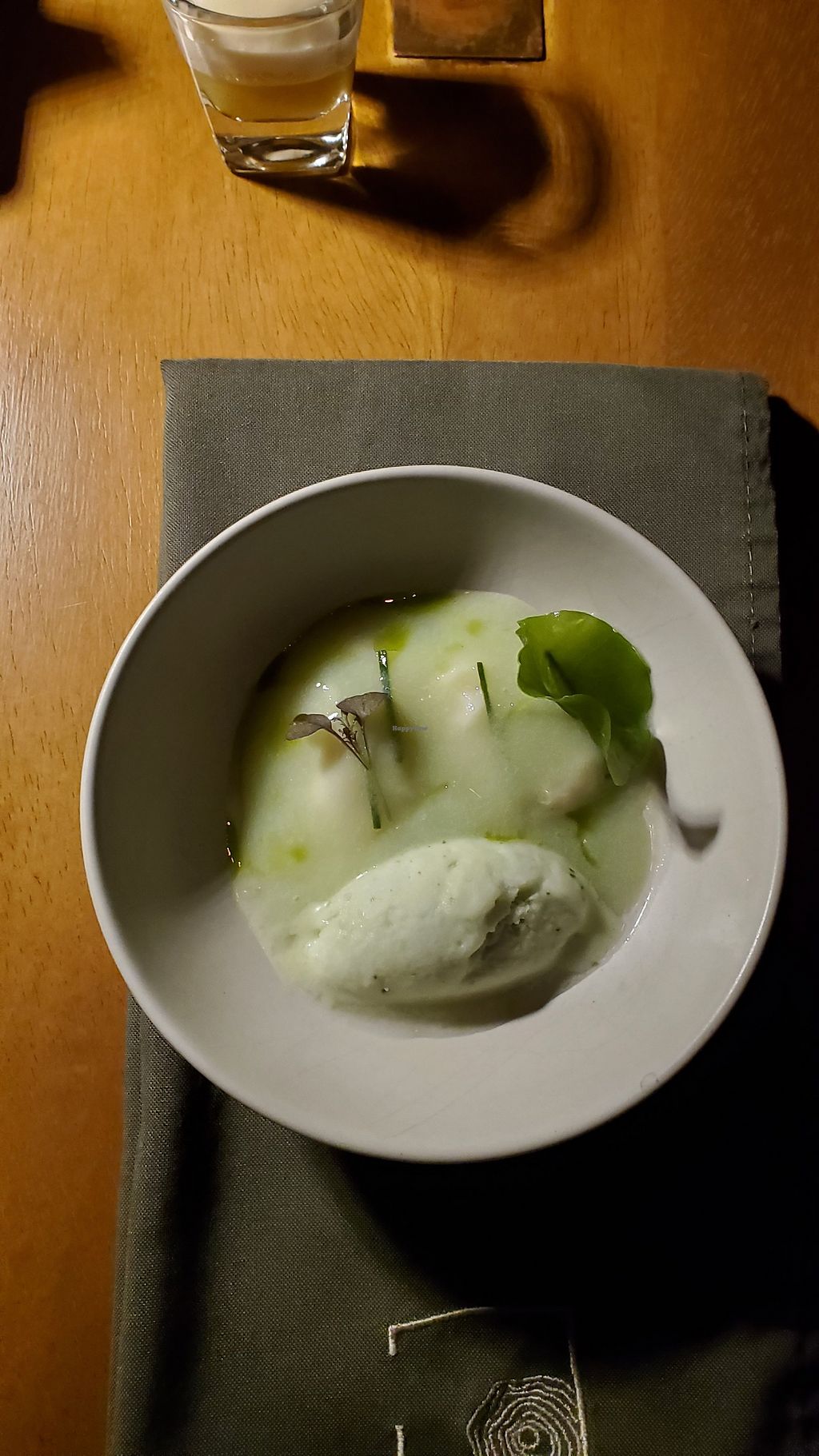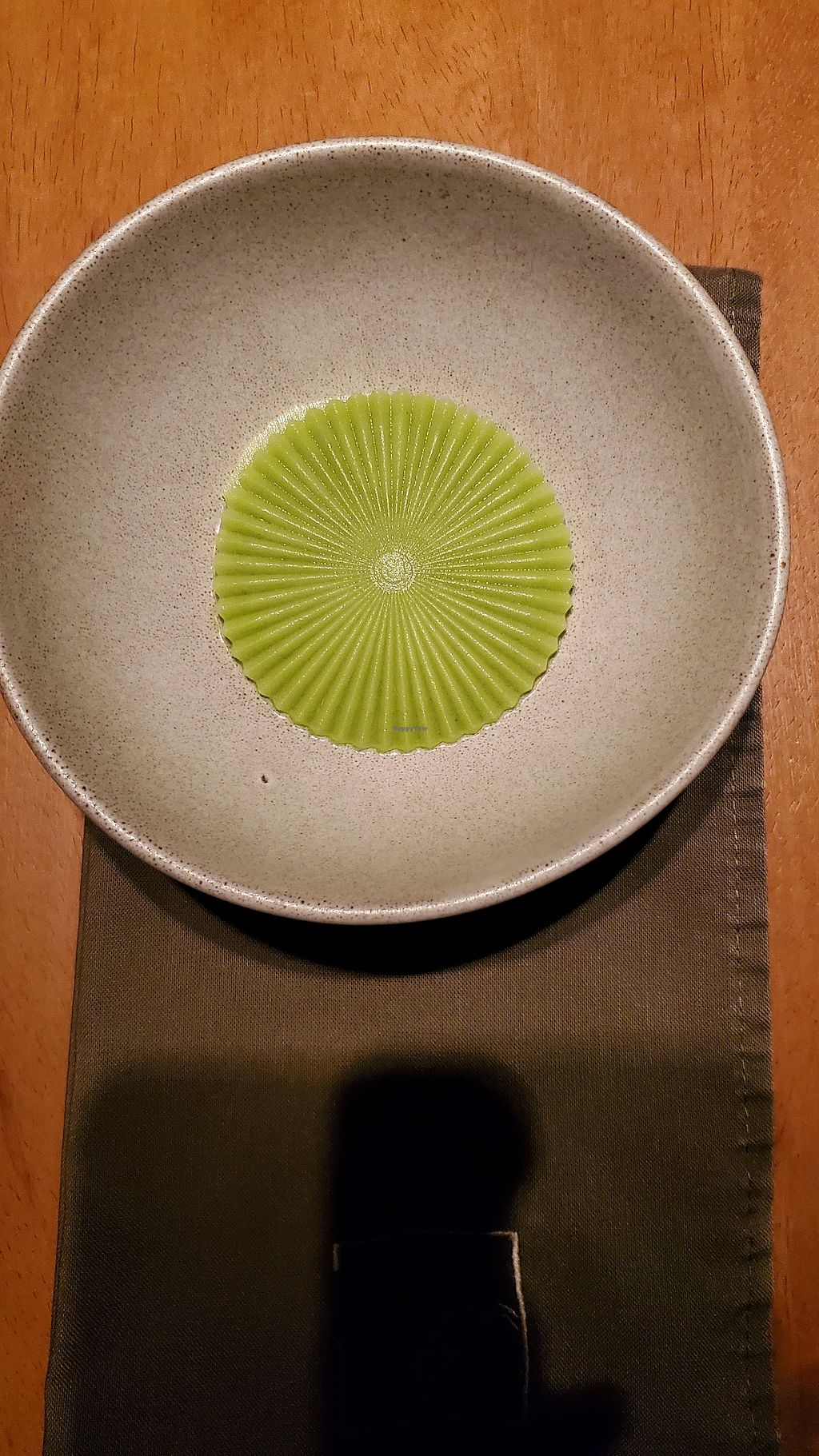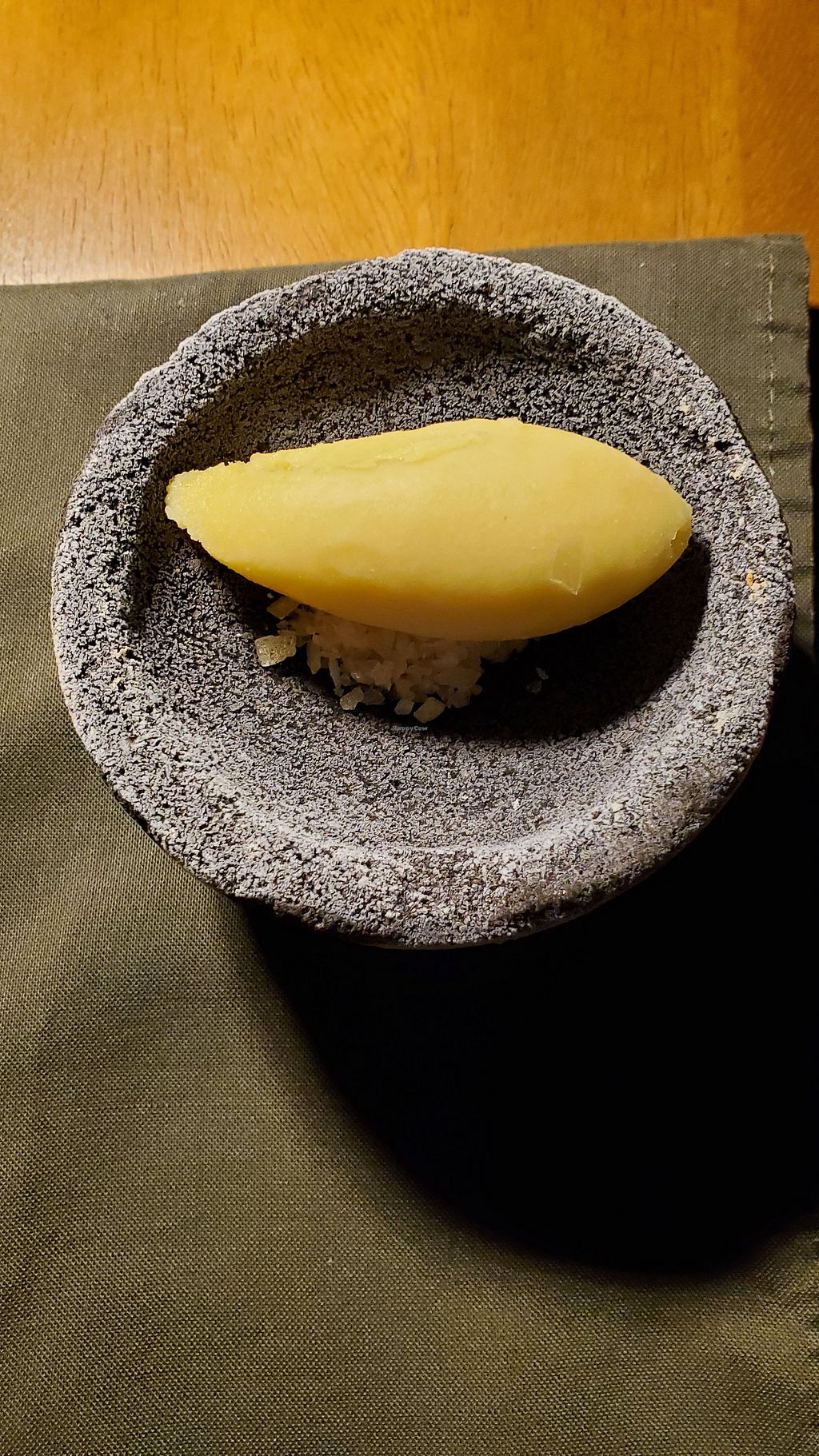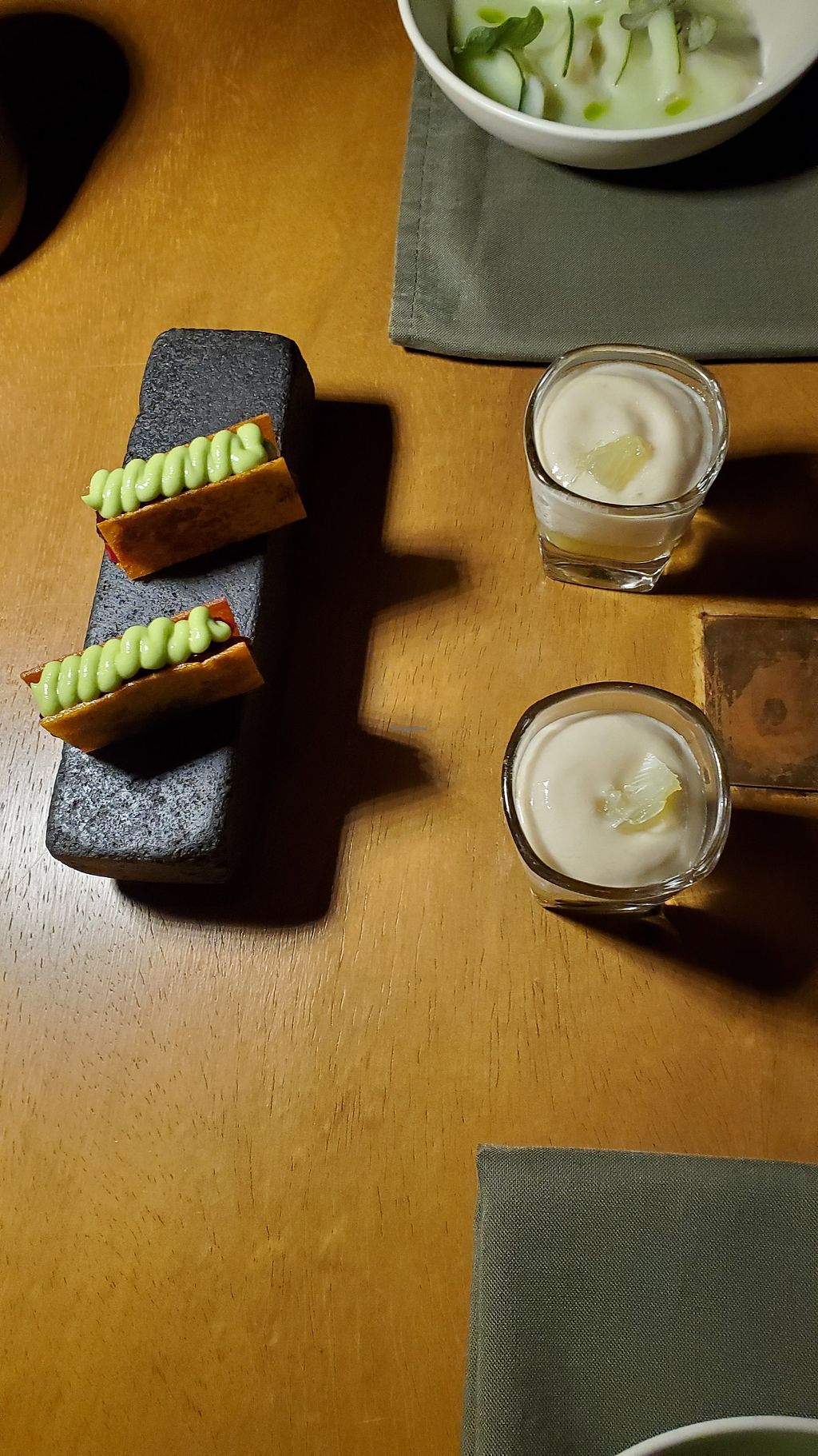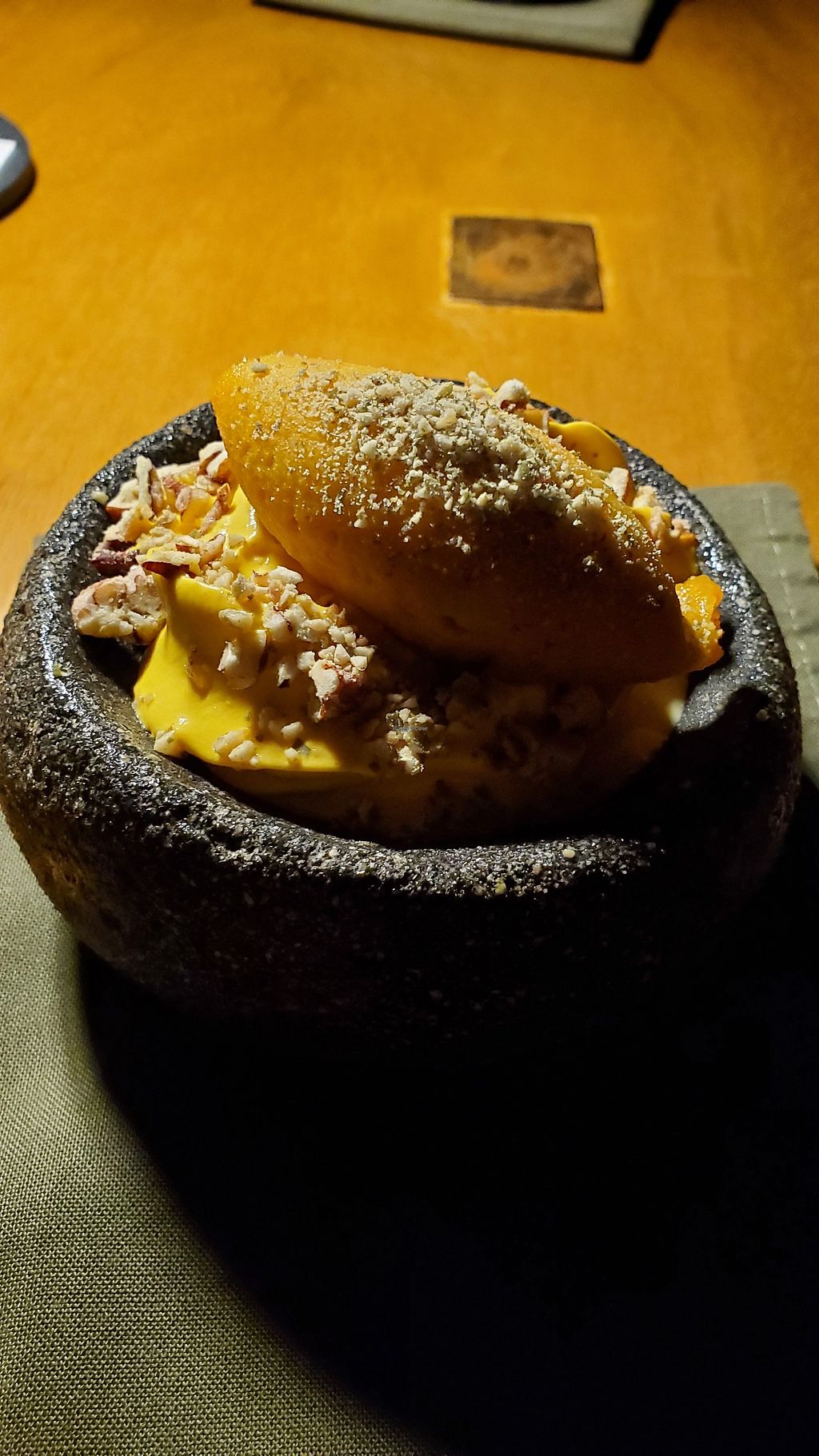 Palm of hearts topped with a tropical sauce, cashews, and rice chips.