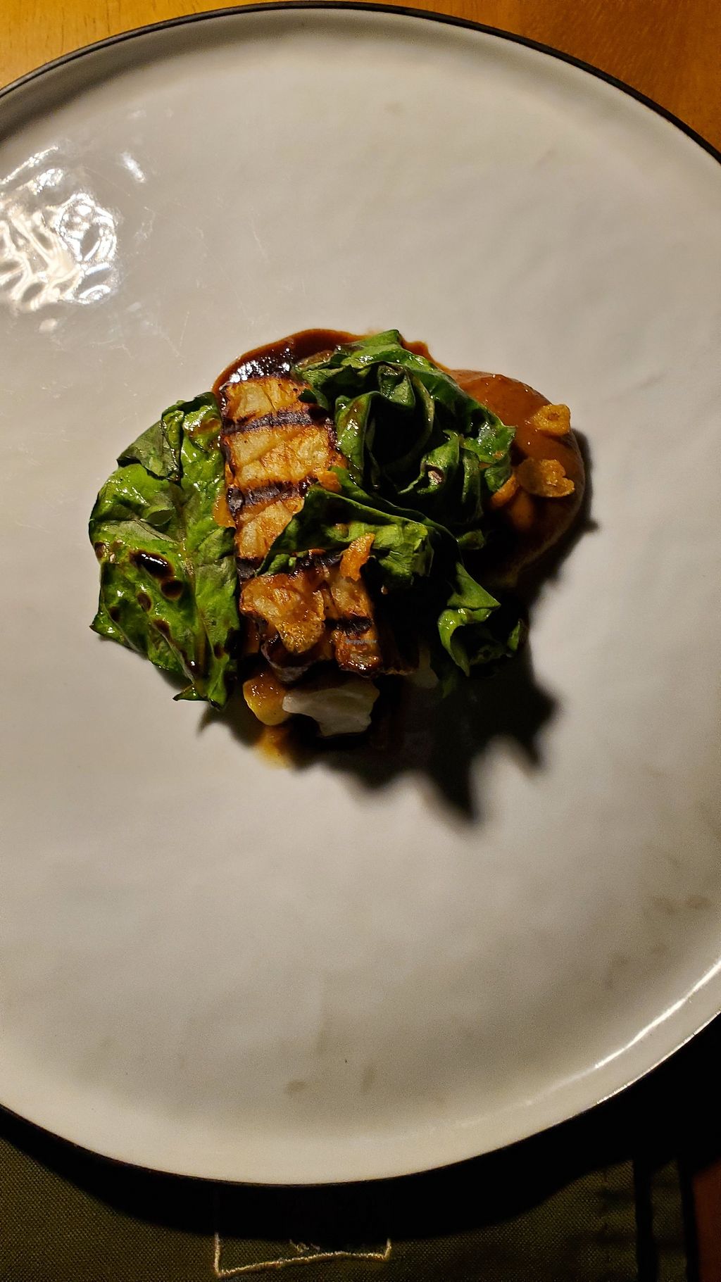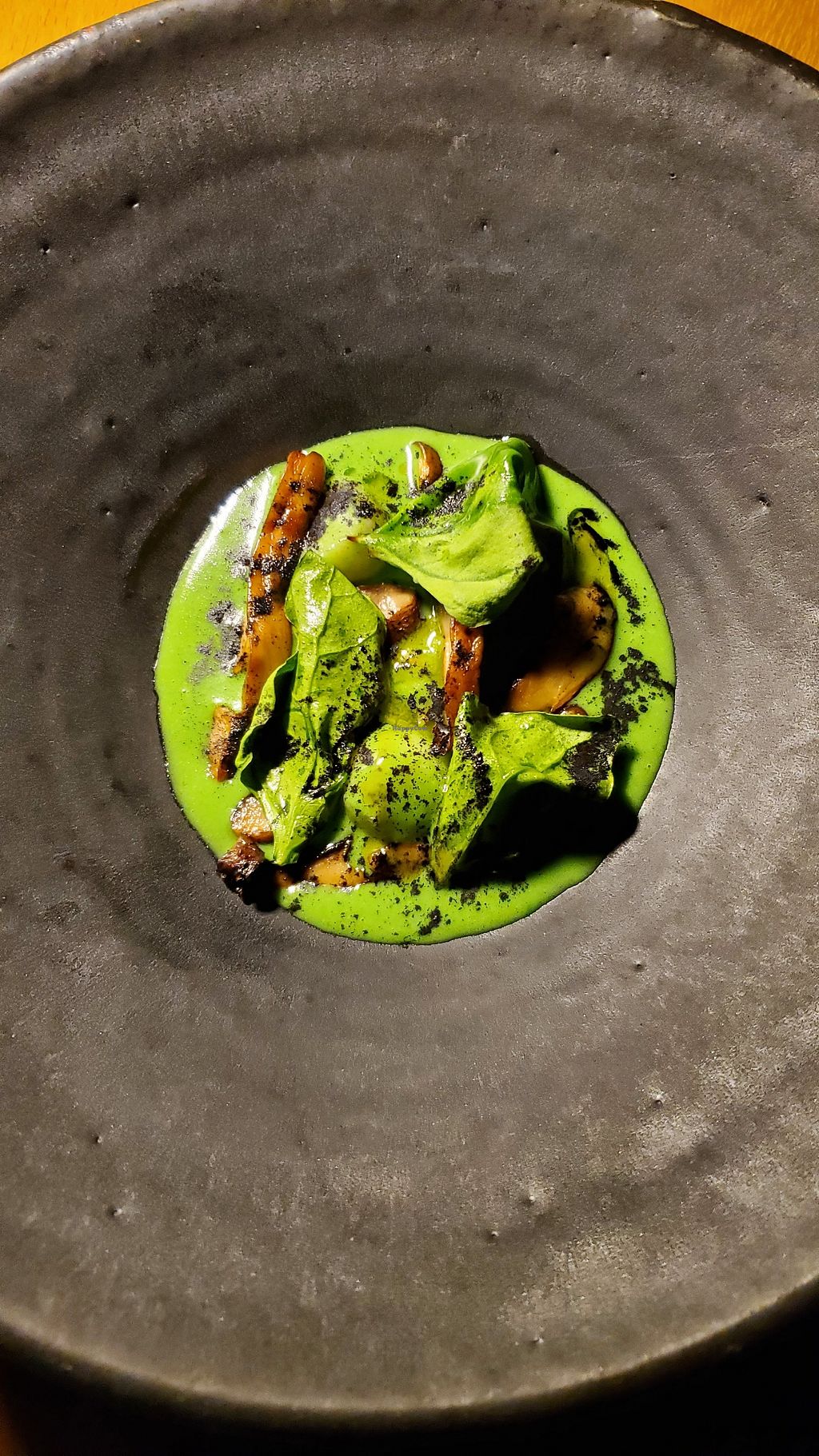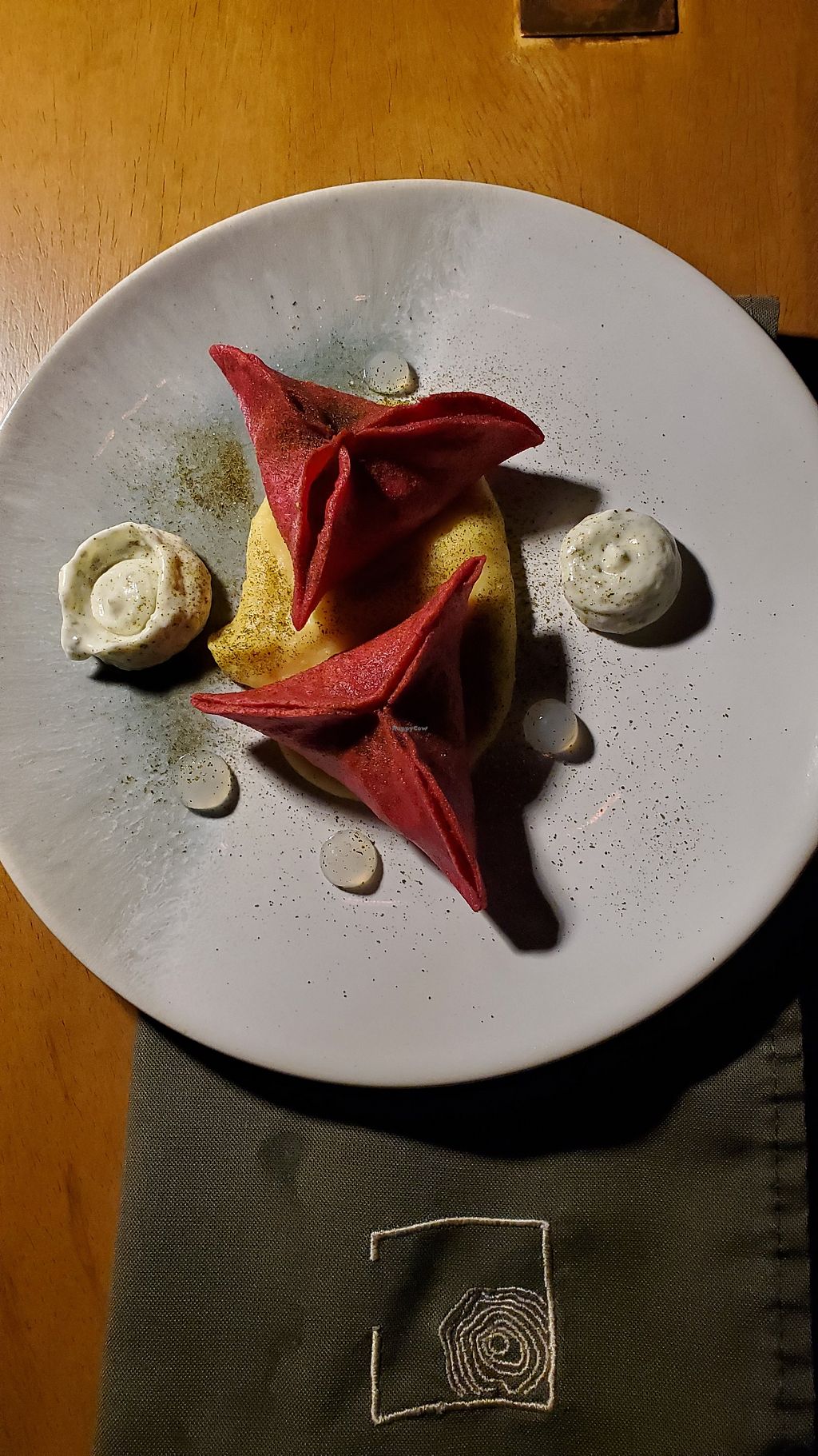 Mashed potato and red pepper, paprika mushrooms, garlic chips