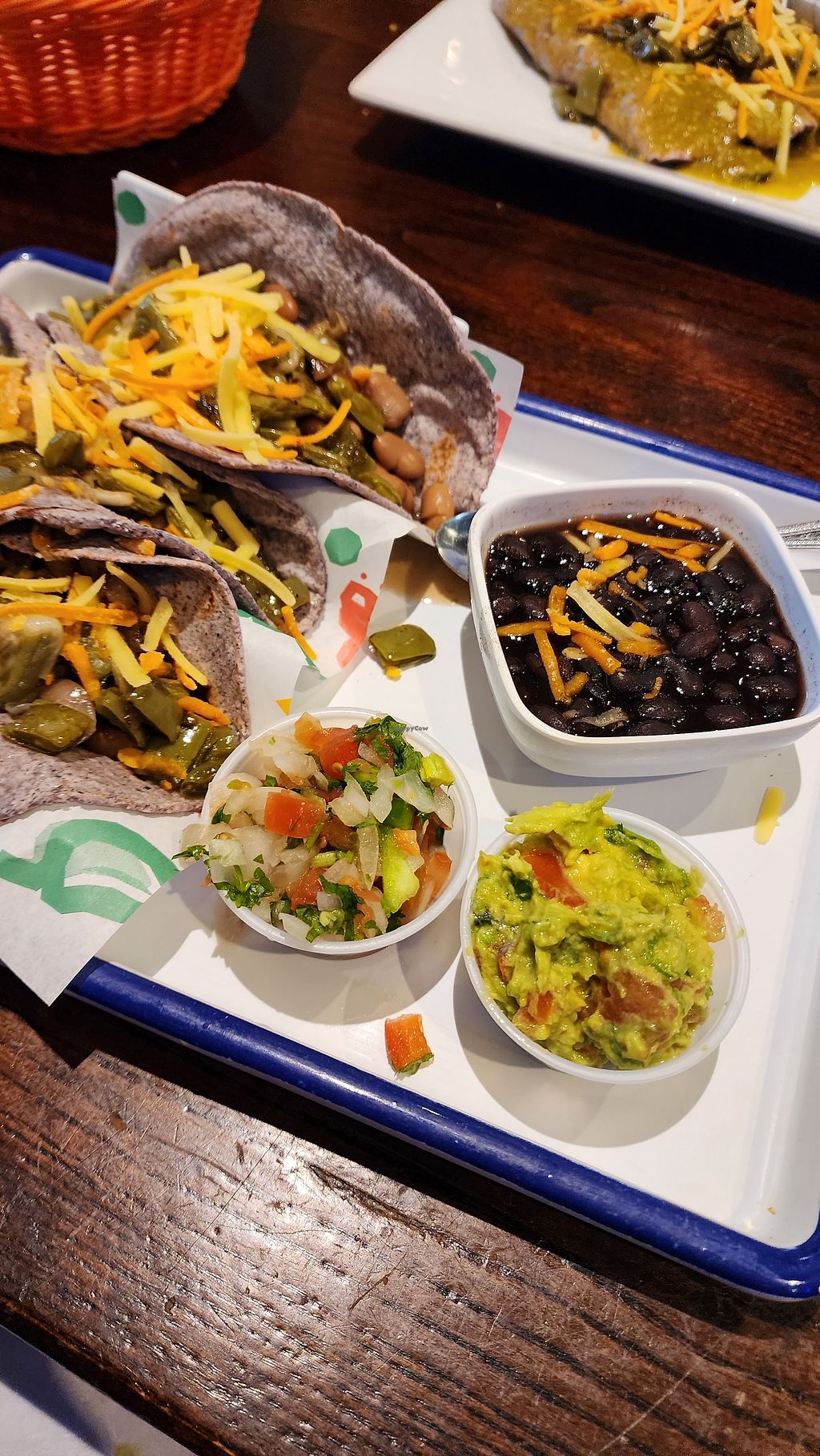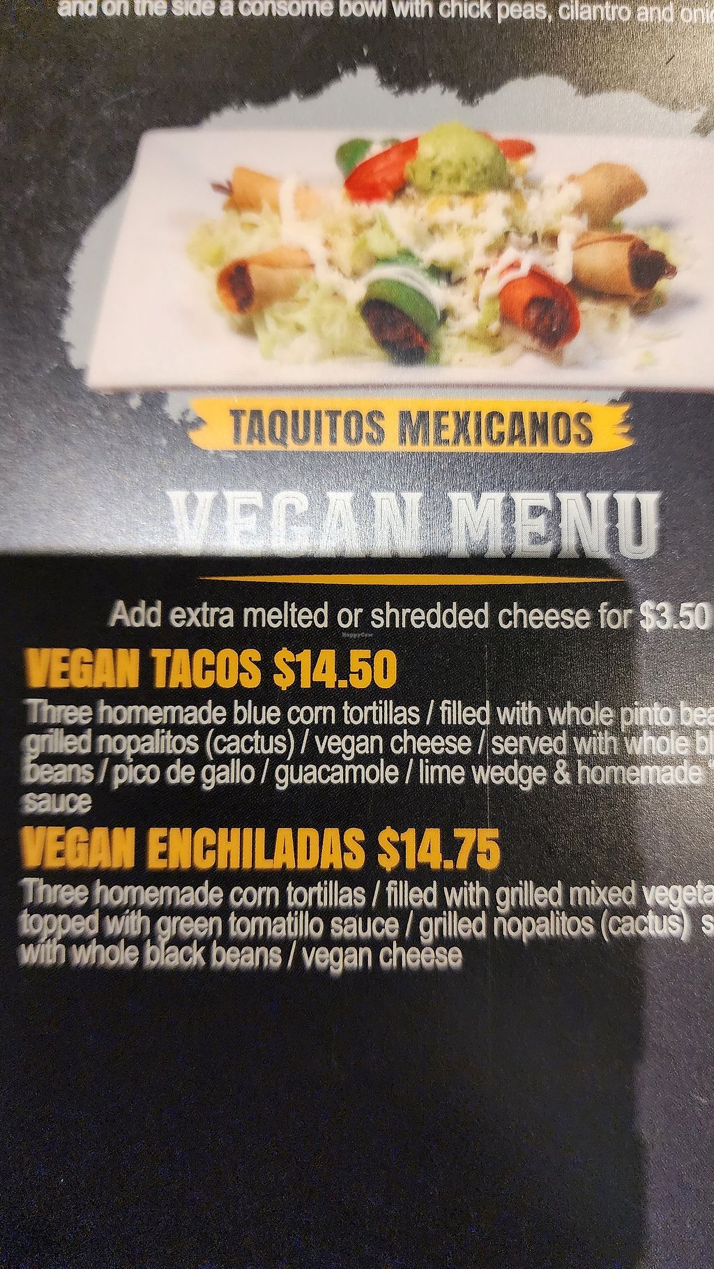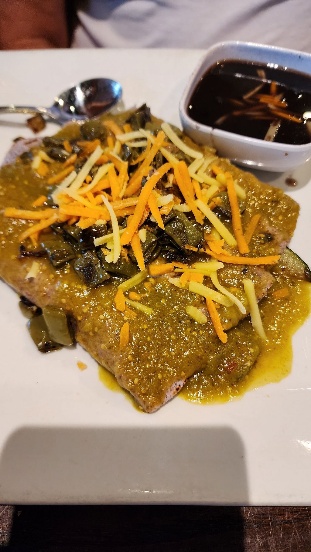 Delicious and flavorful vegan enchiladas. Served with a side of black beans. Serving size was generous. Service was prompt and friendly.