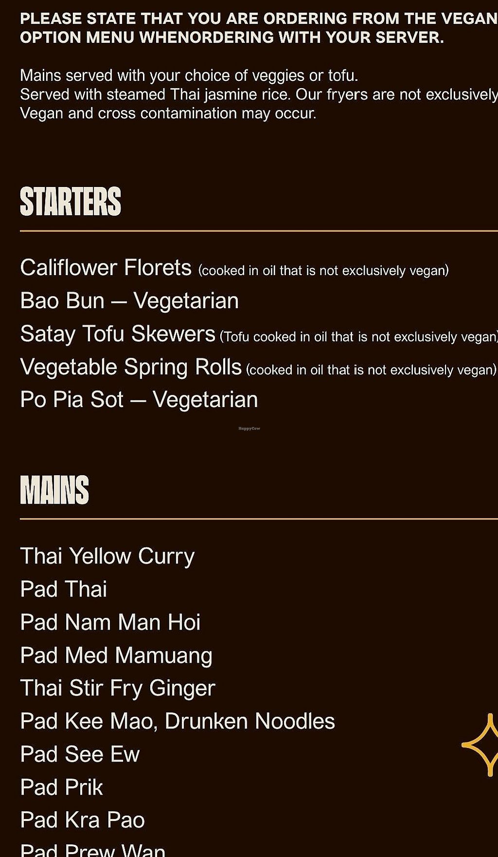 Serves meat, vegan options available. Small Thai chain restaurant with a separate vegan menu. Ask for the specific vegan menu when ordering. Vegan selection includes pad thai, yellow curry, pad prik (red curry stir-fry), pad kra pao (holy basil stir-fry) and more. Open Mon-Wed 16:00-21:30, Thu 16:00-22:00, Fri-Sat 12:30-22:00, Sun 13:00-21:30.